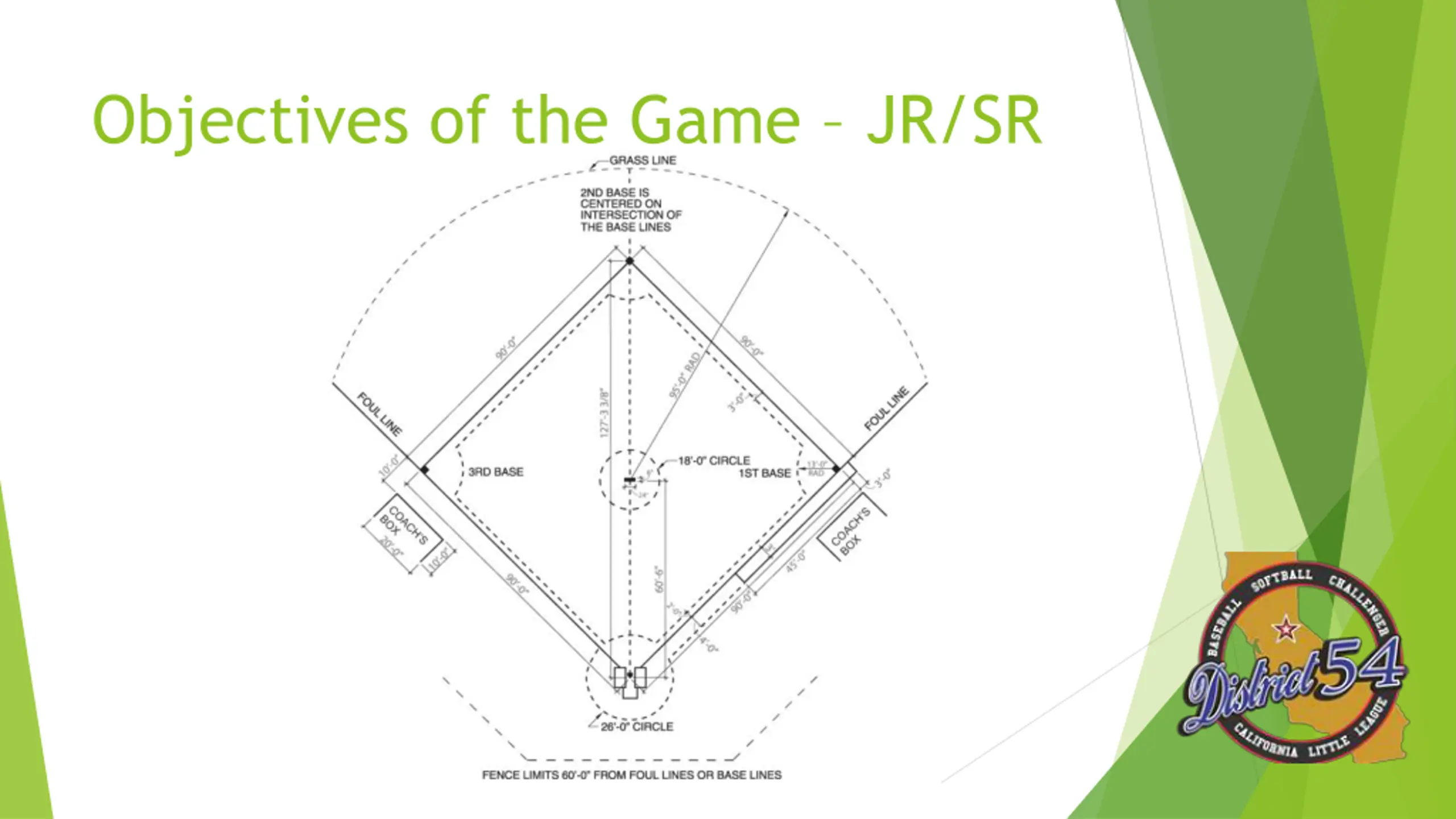 Objectives of the Game The Playing Field (1.04) THE PLAYING FIELD. The field shall be laid out according to the instructions, supplemented Diagram by No. 1 and The infield shall be a 60-foot square. Diagrams No. 3, No. 4 and No. 5 for Intermediate (50-70) Division/Junior/Senior League. (BASEBALL) (TEE BALL OPTION: The infield may be a 50-foot square.) [Intermediate (50-70) division baseball: 90-foot square.] [Junior/senior league BASEBALL: 90-foot square.] [CHALLENGER: The infield shall be a 50- or 60-foot square.] The outfield shall be the area between two foul lines formed by extending two sides of the square, as in Diagram 1. The distance from home base to the nearest fence, stand, or other obstruction on fair territory should be 200 feet or more BASEBALL: [200 feet or more for Intermediate (50-70) Division and 300 feet or more for Junior/Senior League]. A distance of 200 feet or more [200 feet or more for Intermediate (50-70) Division and 300 feet or more for Junior/Senior League] along the foul lines and to center field is recommended. The infield shall be graded so that the base lines and home plate are level.