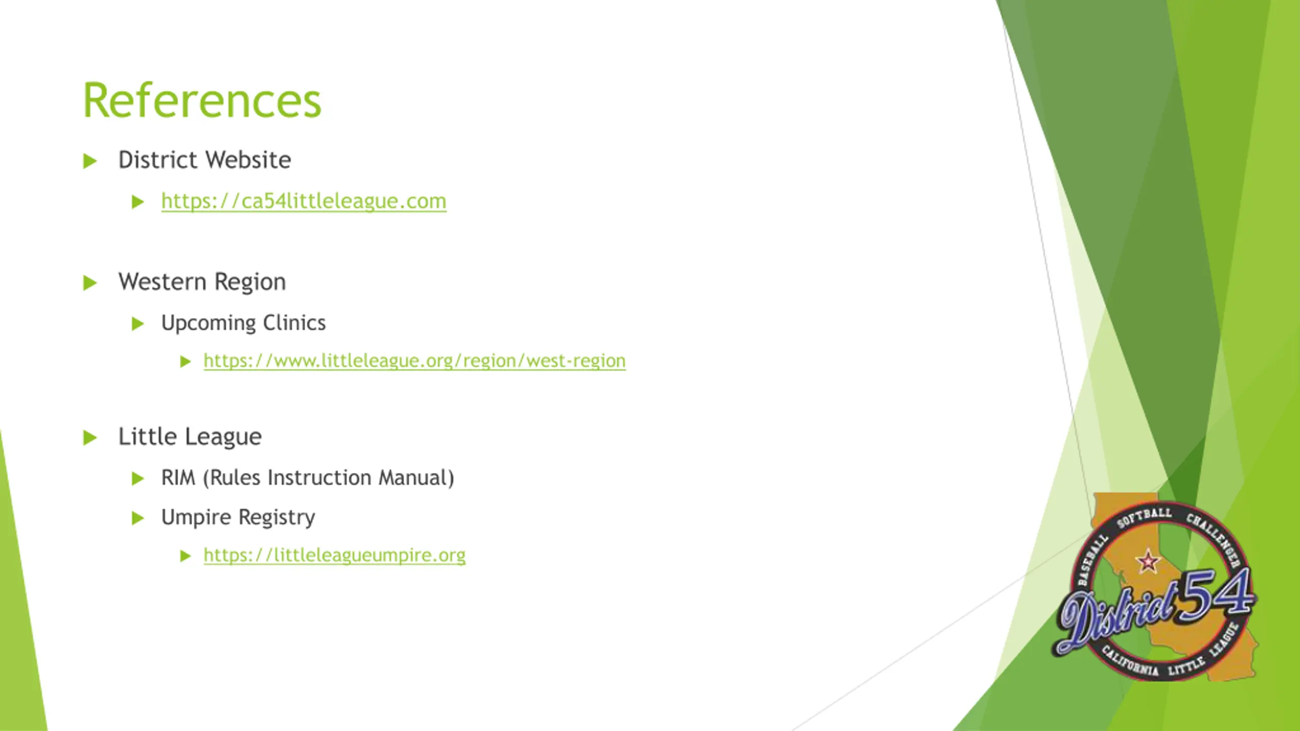 References District Website https://ca54littleleague.com Western Region Upcoming Clinics https://www.littleleague.org/region/west-region Little League RIM (Rules Instruction Manual) Umpire Registry https://littleleagueumpire.org