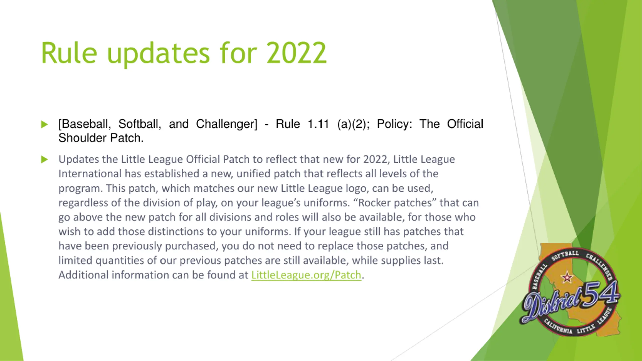 Rule updates for 2022 [Baseball, Softball, and Challenger] - Rule 1.11 (a)(2); Policy: The Official Shoulder Patch. Updates the Little League Official Patch to reflect that new for 2022, Little League International has established a new, unified patch that reflects all levels of the program. This patch, which matches our new Little League logo, can be used, regardless of the division of play, on your league s uniforms. Rocker patches that can go above the new patch for all divisions and roles will also be available, for those who wish to add those distinctions to your uniforms. If your league still has patches that have been previously purchased, you do not need to replace those patches, and limited quantities of our previous patches are still available, while supplies last. Additional information can be found at LittleLeague.org/Patch.