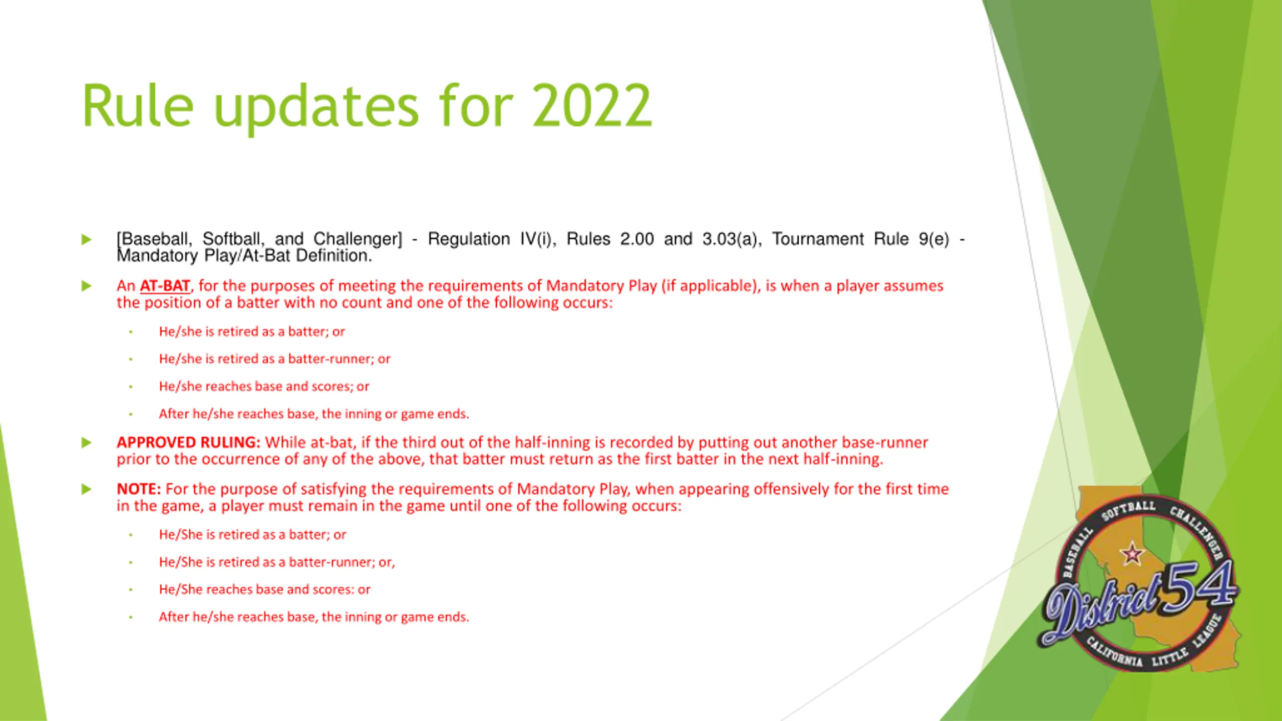 Rule updates for 2022 [Baseball, Softball, and Challenger] - Regulation IV(i), Rules 2.00 and 3.03(a), Tournament Rule 9(e) - Mandatory Play/At-Bat Definition. An AT-BAT, for the purposes of meeting the requirements of Mandatory Play (if applicable), is when a player assumes the position of a batter with no count and one of the following occurs: He/she is retired as a batter; or He/she is retired as a batter-runner; or He/she reaches base and scores; or After he/she reaches base, the inning or game ends. APPROVED RULING: While at-bat, if the third out of the half-inning is recorded by putting out another base-runner prior to the occurrence of any of the above, that batter must return as the first batter in the next half-inning. NOTE: For the purpose of satisfying the requirements of Mandatory Play, when appearing offensively for the first time in the game, a player must remain in the game until one of the following occurs: He/She is retired as a batter; or He/She is retired as a batter-runner; or, He/She reaches base and scores: or After he/she reaches base, the inning or game ends.