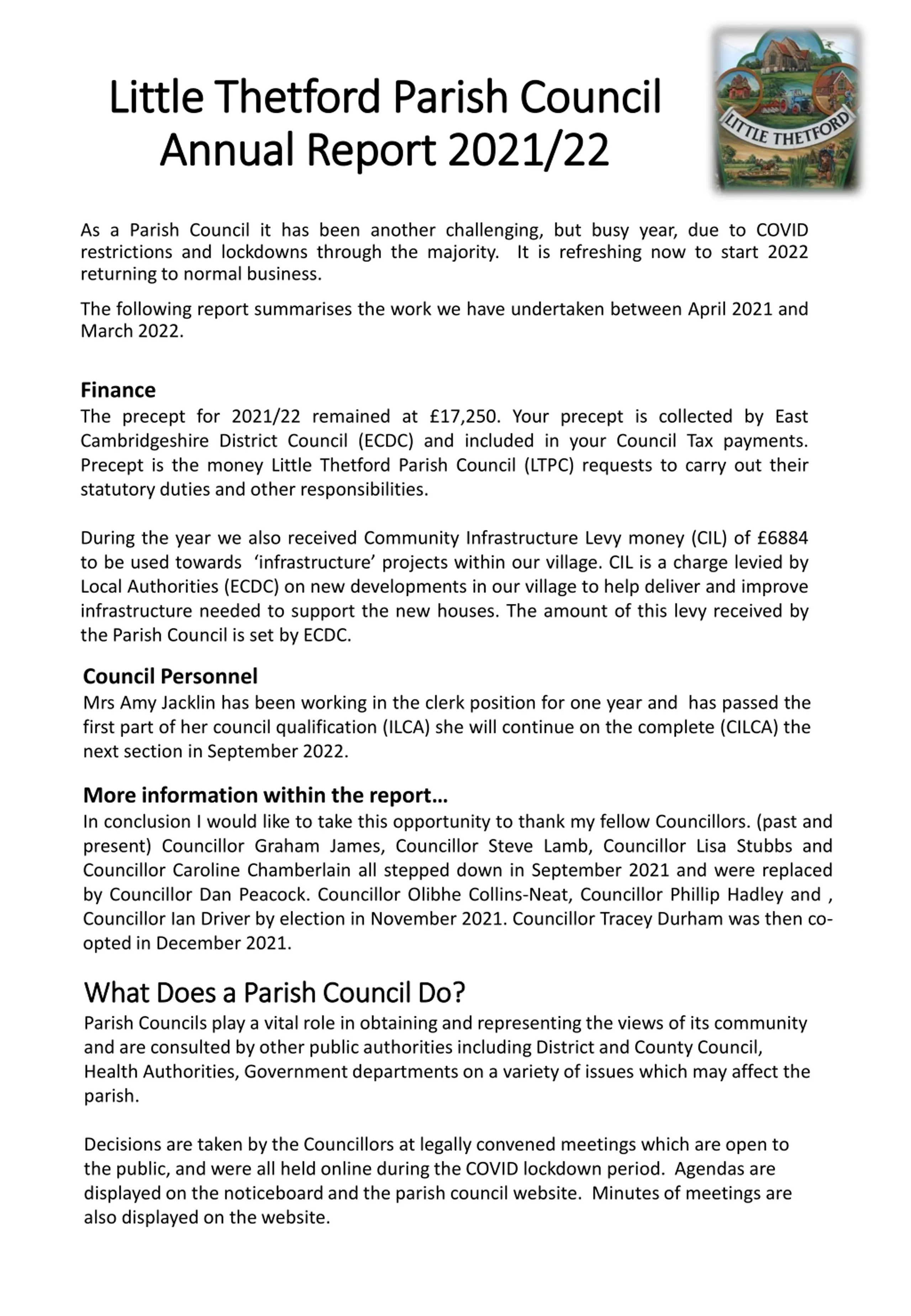Little Thetford Parish Council Annual Report 2021/22 Summary