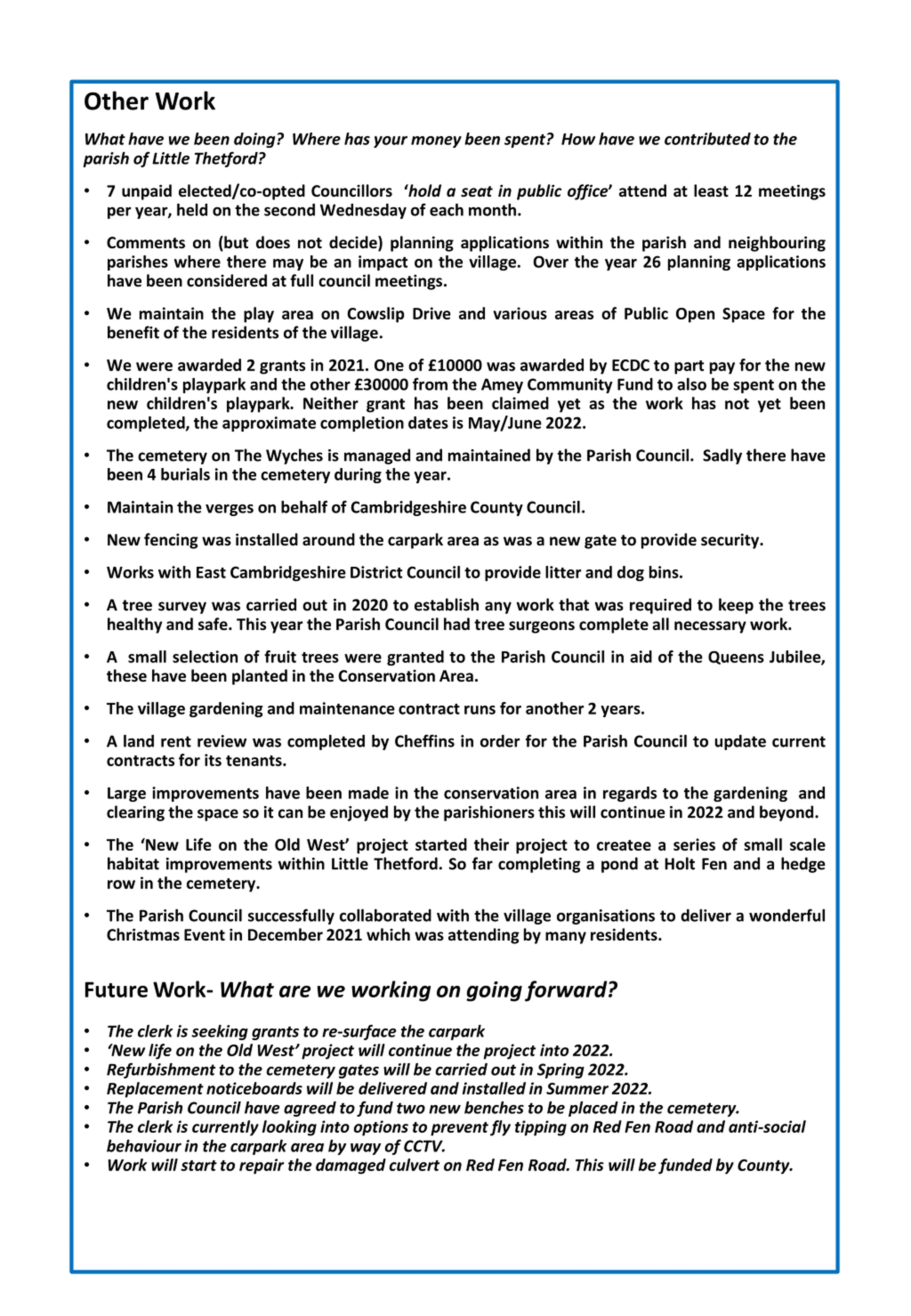 Other Work What have we been doing? Where has your money been spent? How have we contributed to the parish of Little Thetford? 7 unpaid elected/co-opted Councillors hold a seat in public office attend at least 12 meetings per year, held on the second Wednesday of each month. Comments on (but does not decide) planning applications within the parish and neighbouring parishes where there may be an impact on the village. Over the year 26 planning applications have been considered at full council meetings. We maintain the play area on Cowslip Drive and various areas of Public Open Space for the benefit of the residents of the village. We were awarded 2 grants in 2021. One of 10000 was awarded by ECDC to part pay for the new children's playpark and the other 30000 from the Amey Community Fund to also be spent on the new children's playpark. Neither grant has been claimed yet as the work has not yet been completed, the approximate completion dates is May/June 2022. The cemetery on The Wyches is managed and maintained by the Parish Council. Sadly there have been 4 burials in the cemetery during the year. Maintain the verges on behalf of Cambridgeshire County Council. New fencing was installed around the carpark area as was a new gate to provide security. Works with East Cambridgeshire District Council to provide litter and dog bins. A tree survey was carried out in 2020 to establish any work that was required to keep the trees healthy and safe. This year the Parish Council had tree surgeons complete all necessary work. A small selection of fruit trees were granted to the Parish Council in aid of the Queens Jubilee, these have been planted in the Conservation Area. The village gardening and maintenance contract runs for another 2 years. A land rent review was completed by Cheffins in order for the Parish Council to update current contracts for its tenants. Large improvements have been made in the conservation area in regards to the gardening and clearing the space so it can be enjoyed by the parishioners this will continue in 2022 and beyond. The New Life on the Old West project started their project to createe a series of small scale habitat improvements within Little Thetford. So far completing a pond at Holt Fen and a hedge row in the cemetery. The Parish Council successfully collaborated with the village organisations to deliver a wonderful Christmas Event in December 2021 which was attending by many residents. Future Work- What are we working on going forward? The clerk is seeking grants to re-surface the carpark New life on the Old West project will continue the project into 2022. Refurbishment to the cemetery gates will be carried out in Spring 2022. Replacement noticeboards will be delivered and installed in Summer 2022. The Parish Council have agreed to fund two new benches to be placed in the cemetery. The clerk is currently looking into options to prevent fly tipping on Red Fen Road and anti-social behaviour in the carpark area by way of CCTV. Work will start to repair the damaged culvert on Red Fen Road. This will be funded by County.