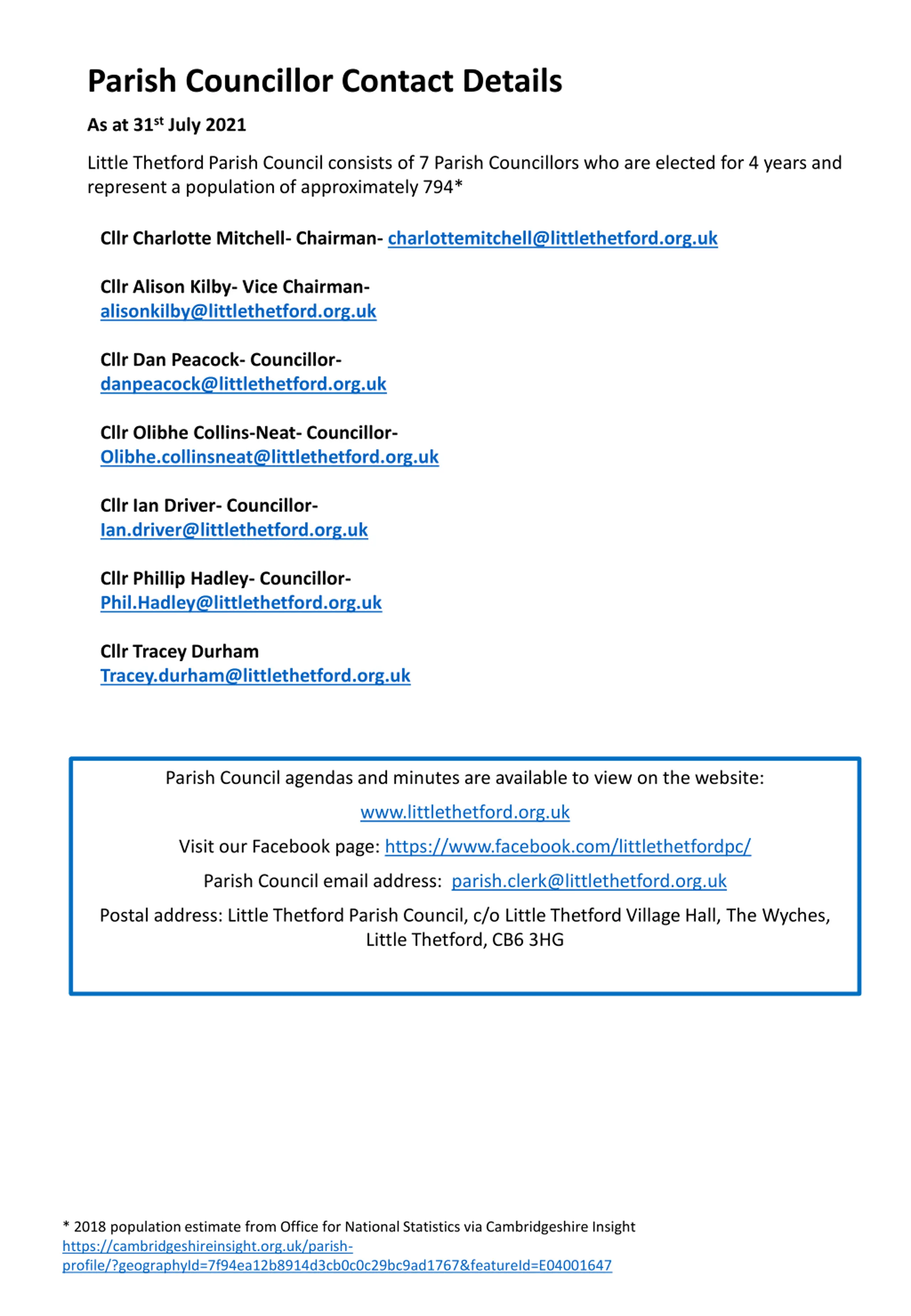 Parish Councillor Contact Details As at 31st July 2021 Little Thetford Parish Council consists of 7 Parish Councillors who are elected for 4 years and represent a population of approximately 794* Cllr Charlotte Mitchell- Chairman- charlottemitchell@littlethetford.org.uk Cllr Alison Kilby- Vice Chairman- alisonkilby@littlethetford.org.uk Cllr Dan Peacock- Councillor- danpeacock@littlethetford.org.uk Cllr Olibhe Collins-Neat- Councillor- Olibhe.collinsneat@littlethetford.org.uk Cllr Ian Driver- Councillor- Ian.driver@littlethetford.org.uk Cllr Phillip Hadley- Councillor- Phil.Hadley@littlethetford.org.uk Cllr Tracey Durham Tracey.durham@littlethetford.org.uk Parish Council agendas and minutes are available to view on the website: www.littlethetford.org.uk Visit our Facebook page: https://www.facebook.com/littlethetfordpc/ Parish Council email address: parish.clerk@littlethetford.org.uk Postal address: Little Thetford Parish Council, c/o Little Thetford Village Hall, The Wyches, Little Thetford, CB6 3HG * 2018 population estimate from Office for National Statistics via Cambridgeshire Insight https://cambridgeshireinsight.org.uk/parish- profile/?geographyId=7f94ea12b8914d3cb0c0c29bc9ad1767&featureId=E04001647