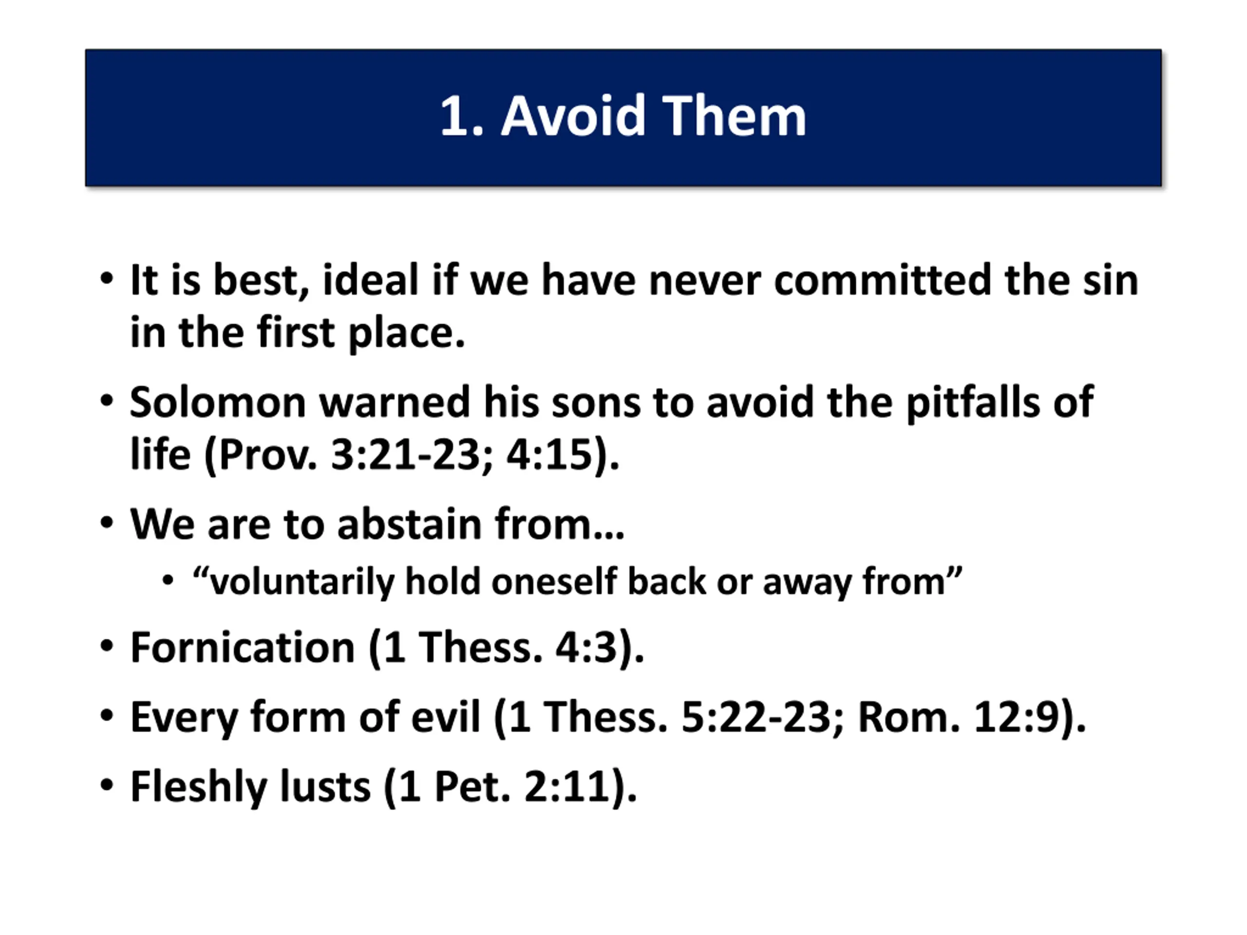 1. Avoid Them It is best, ideal if we have never committed the sin in the first place. Solomon warned his sons to avoid the pitfalls of life (Prov. 3:21-23; 4:15). We are to abstain from voluntarily hold oneself back or away from Fornication (1 Thess. 4:3). Every form of evil (1 Thess. 5:22-23; Rom. 12:9). Fleshly lusts (1 Pet. 2:11).