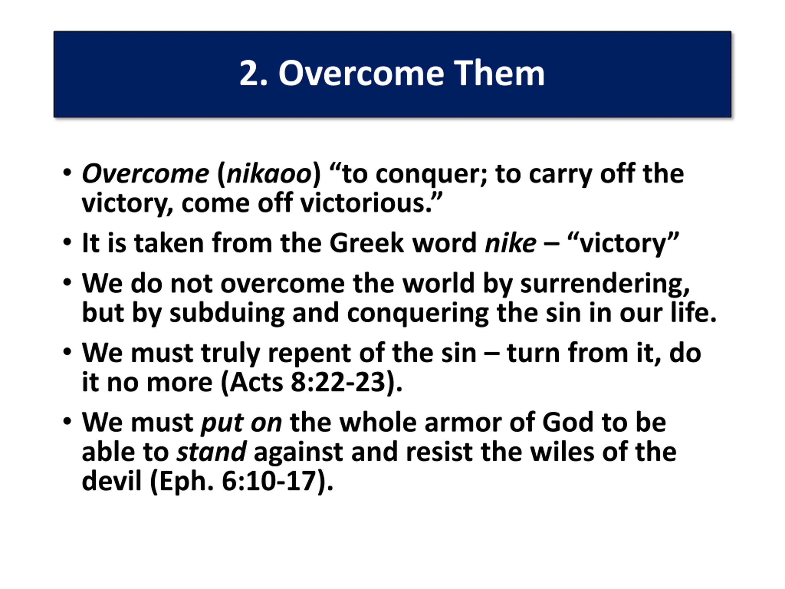 2. Overcome Them Overcome (nikaoo) to conquer; to carry off the victory, come off victorious. It is taken from the Greek word nike victory We do not overcome the world by surrendering, but by subduing and conquering the sin in our life. We must truly repent of the sin turn from it, do it no more (Acts 8:22-23). We must put on the whole armor of God to be able to stand against and resist the wiles of the devil (Eph. 6:10-17).