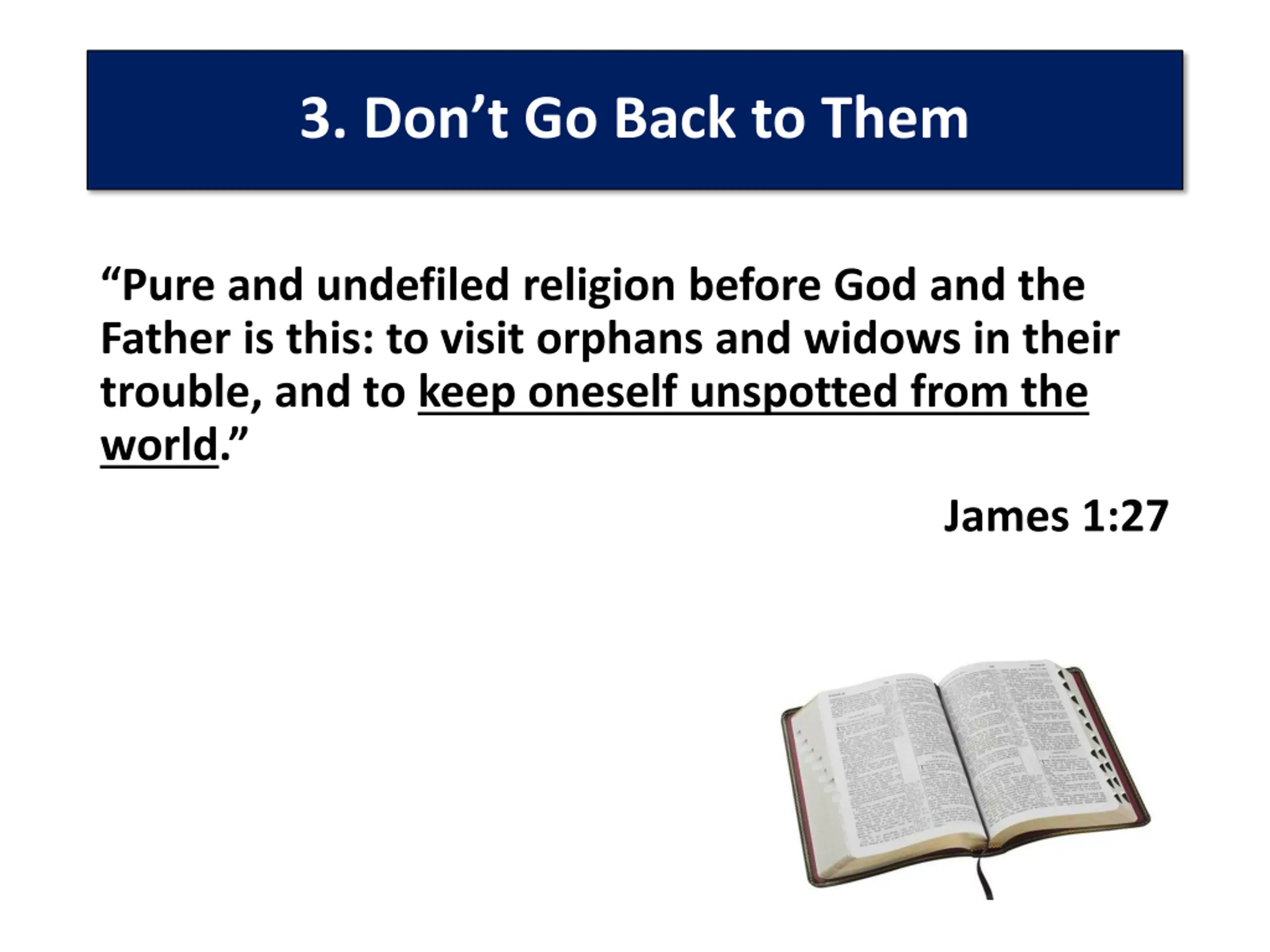 3. Dont Go Back to Them Pure and undefiled religion before God and the Father is this: to visit orphans and widows in their trouble, and to keep oneself unspotted from the world. James 1:27
