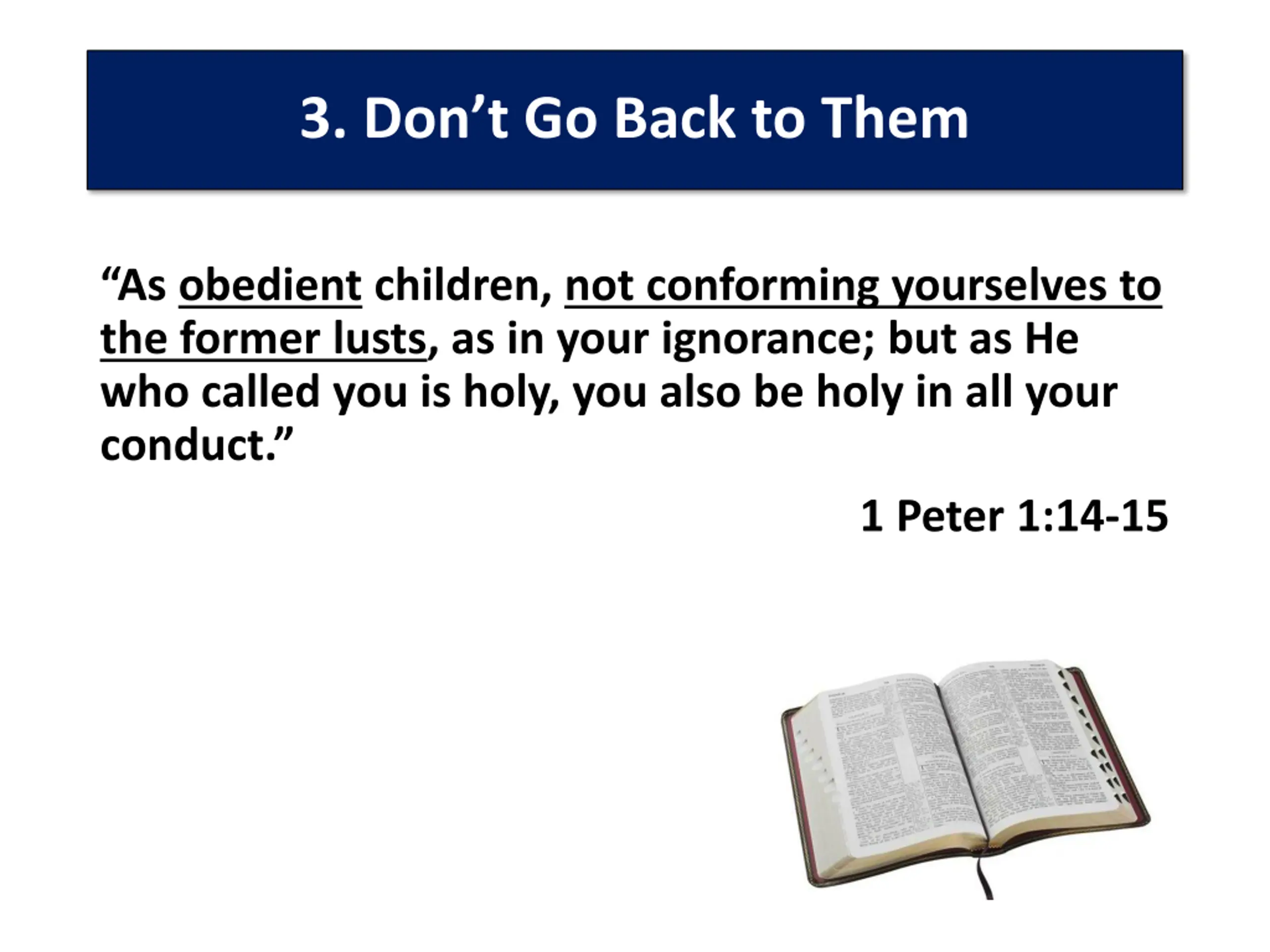 3. Dont Go Back to Them As obedient children, not conforming yourselves to the former lusts, as in your ignorance; but as He who called you is holy, you also be holy in all your conduct. 1 Peter 1:14-15