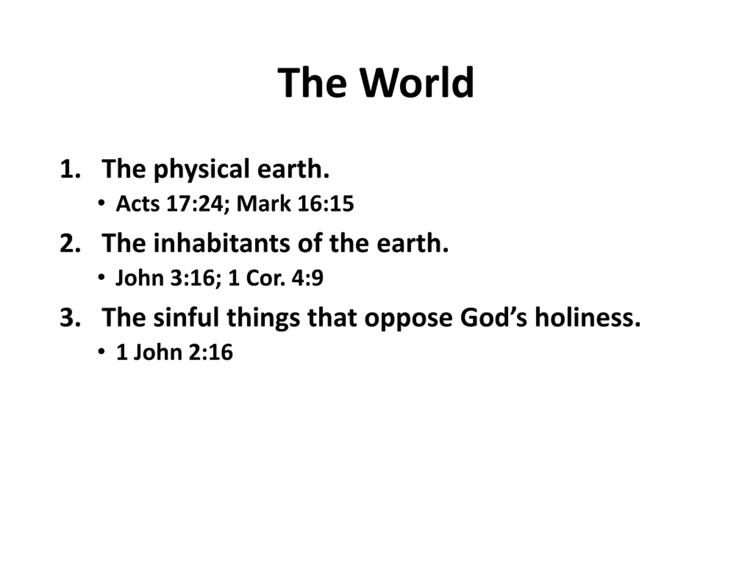 The World 1. The physical earth. Acts 17:24; Mark 16:15 2. The inhabitants of the earth. John 3:16; 1 Cor. 4:9 3. The sinful things that oppose God s holiness. 1 John 2:16