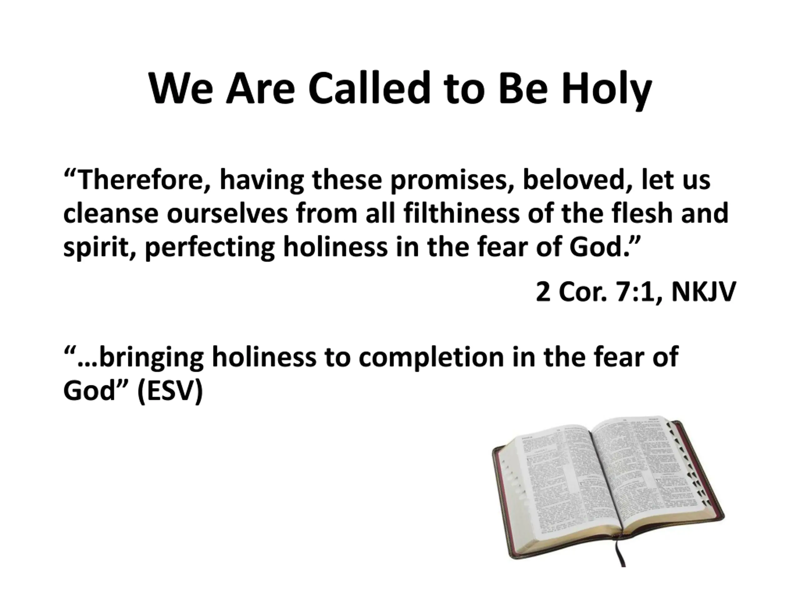 We Are Called to Be Holy Therefore, having these promises, beloved, let us cleanse ourselves from all filthiness of the flesh and spirit, perfecting holiness in the fear of God. 2 Cor. 7:1, NKJV bringing holiness to completion in the fear of God (ESV)