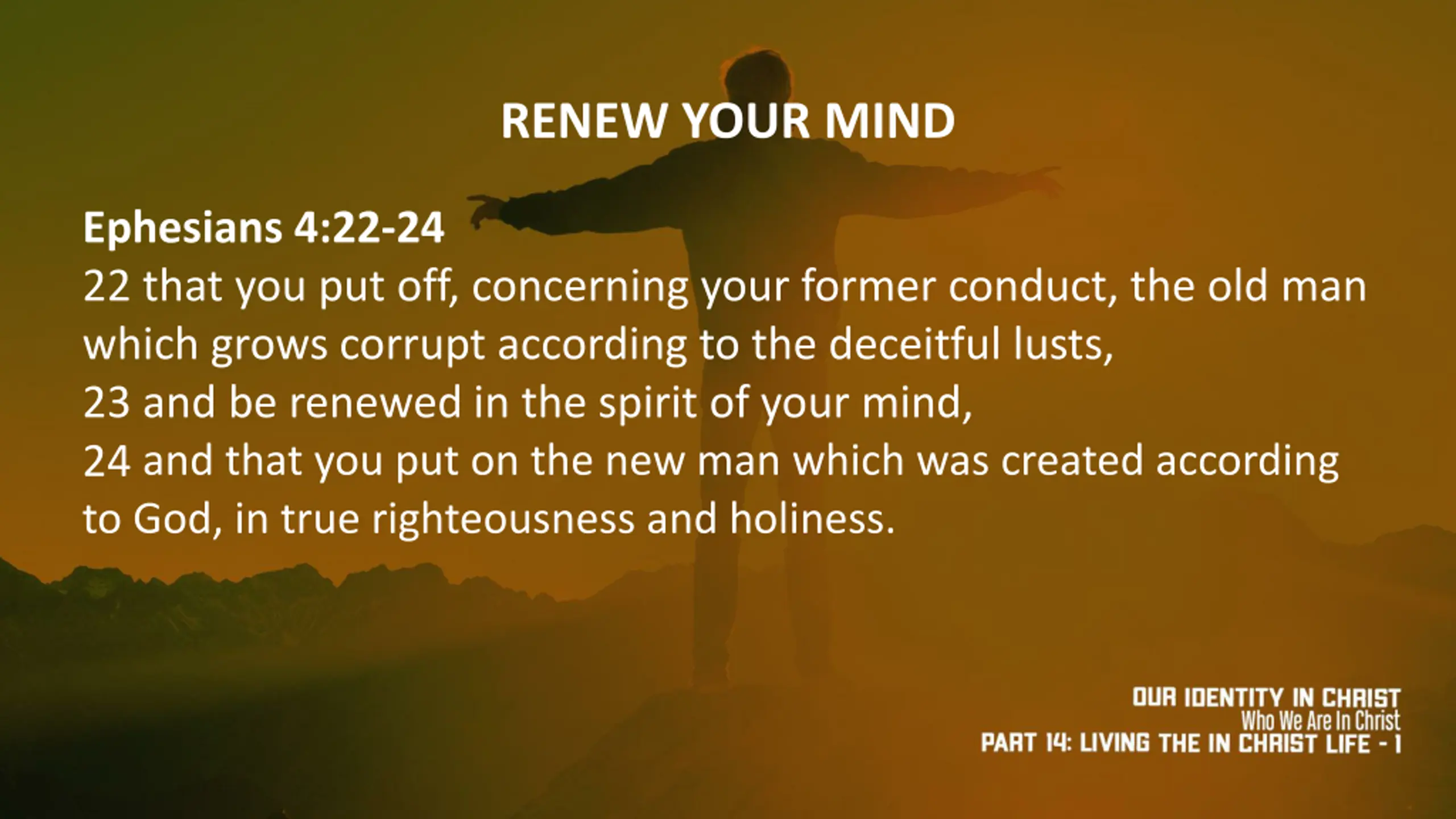 RENEW YOUR MIND Ephesians 4:22-24 22 that you put off, concerning your former conduct, the old man which grows corrupt according to the deceitful lusts, 23 and be renewed in the spirit of your mind, 24 and that you put on the new man which was created according to God, in true righteousness and holiness.