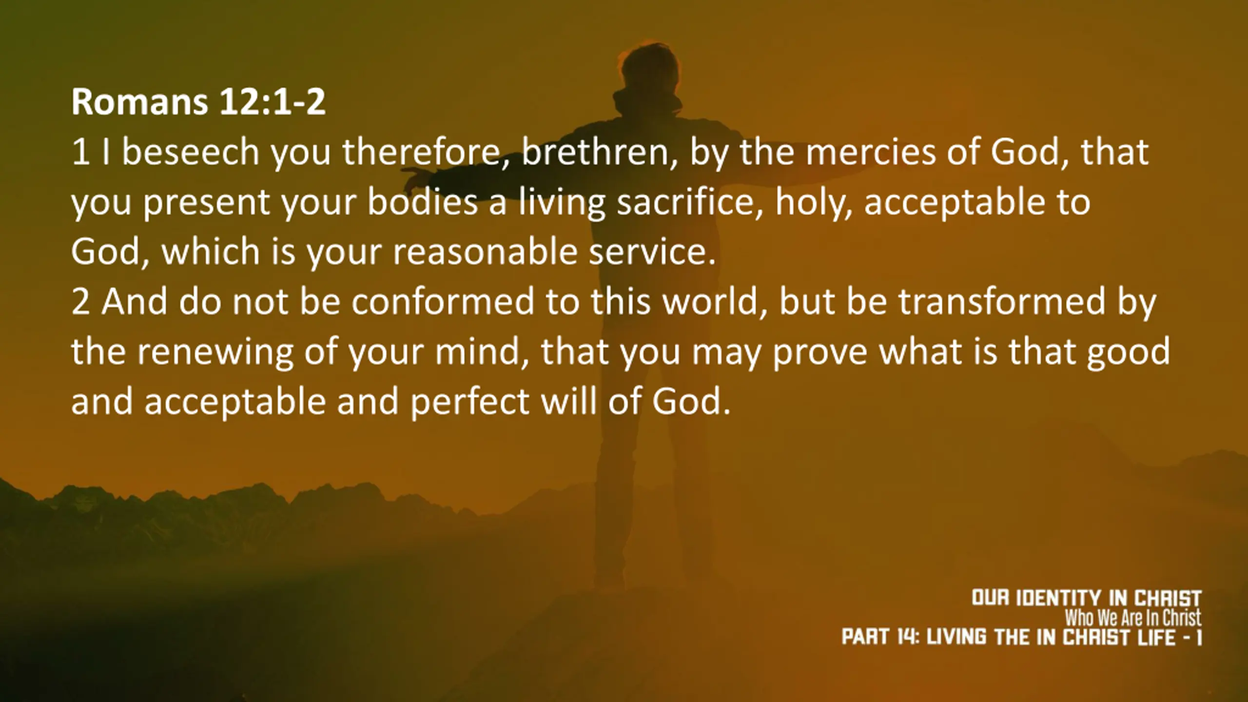 Romans 12:1-2 1 I beseech you therefore, brethren, by the mercies of God, that you present your bodies a living sacrifice, holy, acceptable to God, which is your reasonable service. 2 And do not be conformed to this world, but be transformed by the renewing of your mind, that you may prove what is that good and acceptable and perfect will of God.