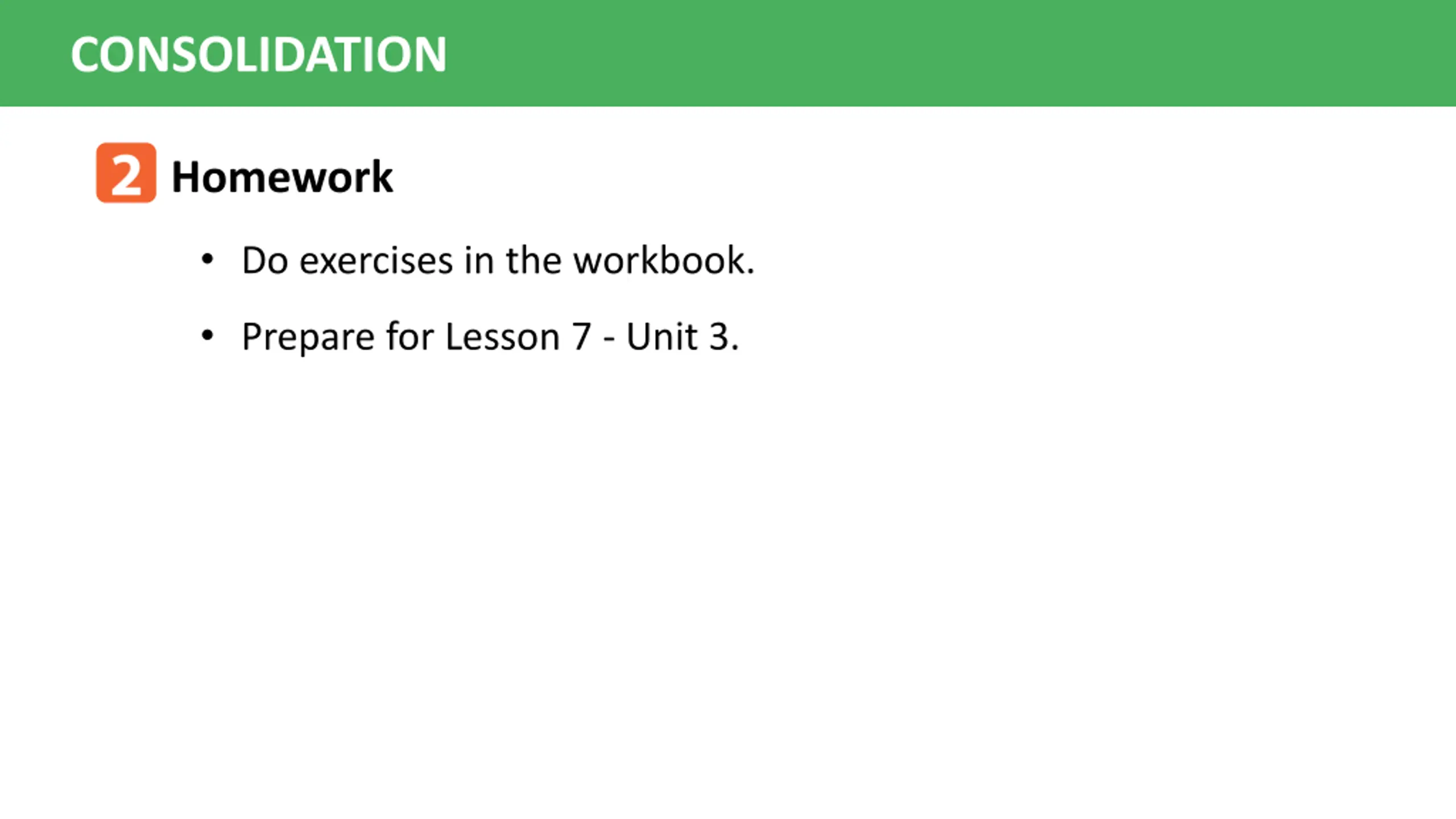 CONSOLIDATION Homework Do exercises in the workbook. Prepare for Lesson 7 - Unit 3.