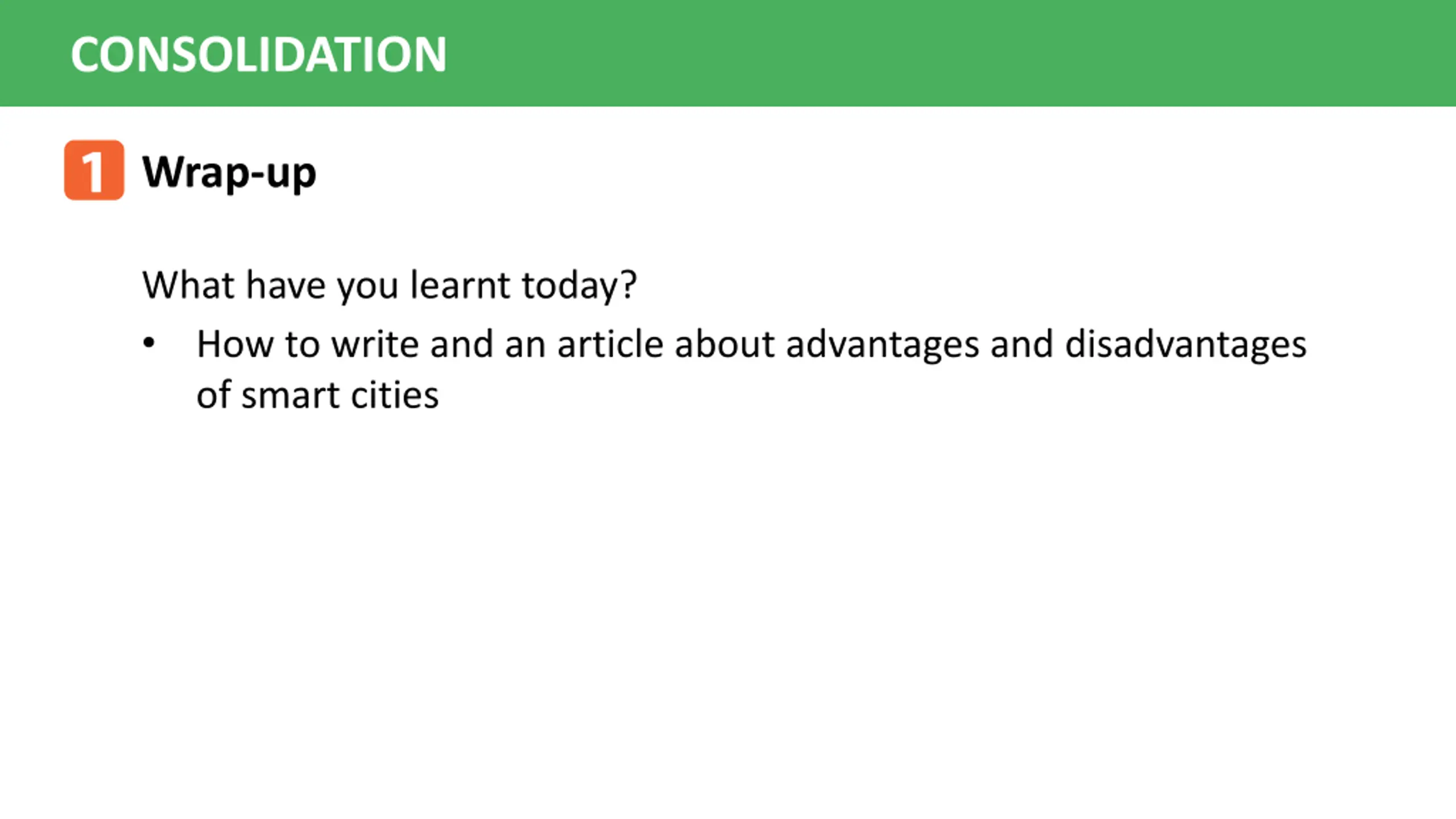 CONSOLIDATION Wrap-up What have you learnt today? How to write and an article about advantages and disadvantages of smart cities
