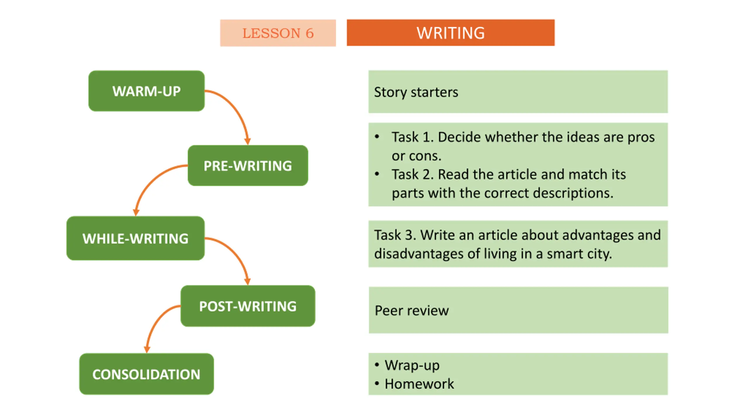 LESSON 6 WRITING WARM-UP Story starters Task 1. Decide whether the ideas are pros or cons. Task 2. Read the article and match its parts with the correct descriptions. PRE-WRITING Task 3. Write an article about advantages and disadvantages of living in a smart city. WHILE-WRITING POST-WRITING Peer review Wrap-up Homework CONSOLIDATION