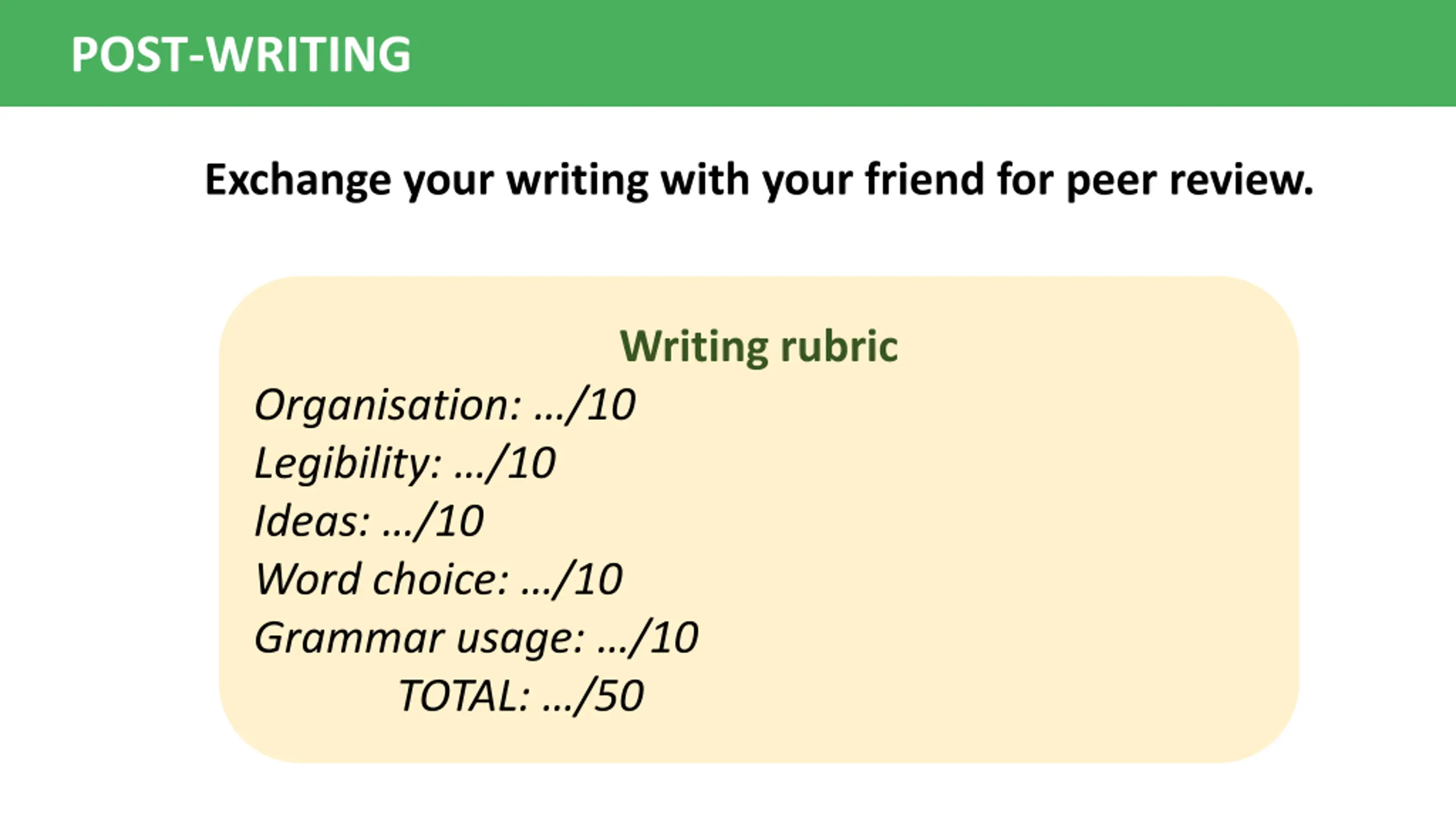 POST-WRITING Exchange your writing with your friend for peer review. Writing rubric Organisation: /10 Legibility: /10 Ideas: /10 Word choice: /10 Grammar usage: /10 TOTAL: /50