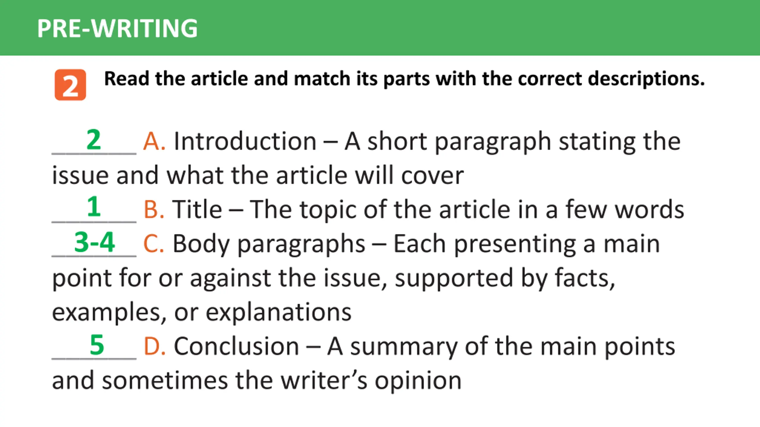 PRE-WRITING Read the article and match its parts with the correct descriptions. 2 ______ A. Introduction A short paragraph stating the issue and what the article will cover ______ B. Title The topic of the article in a few words ______ C. Body paragraphs Each presenting a main point for or against the issue, supported by facts, examples, or explanations ______ D. Conclusion A summary of the main points and sometimes the writer s opinion 1 3-4 5