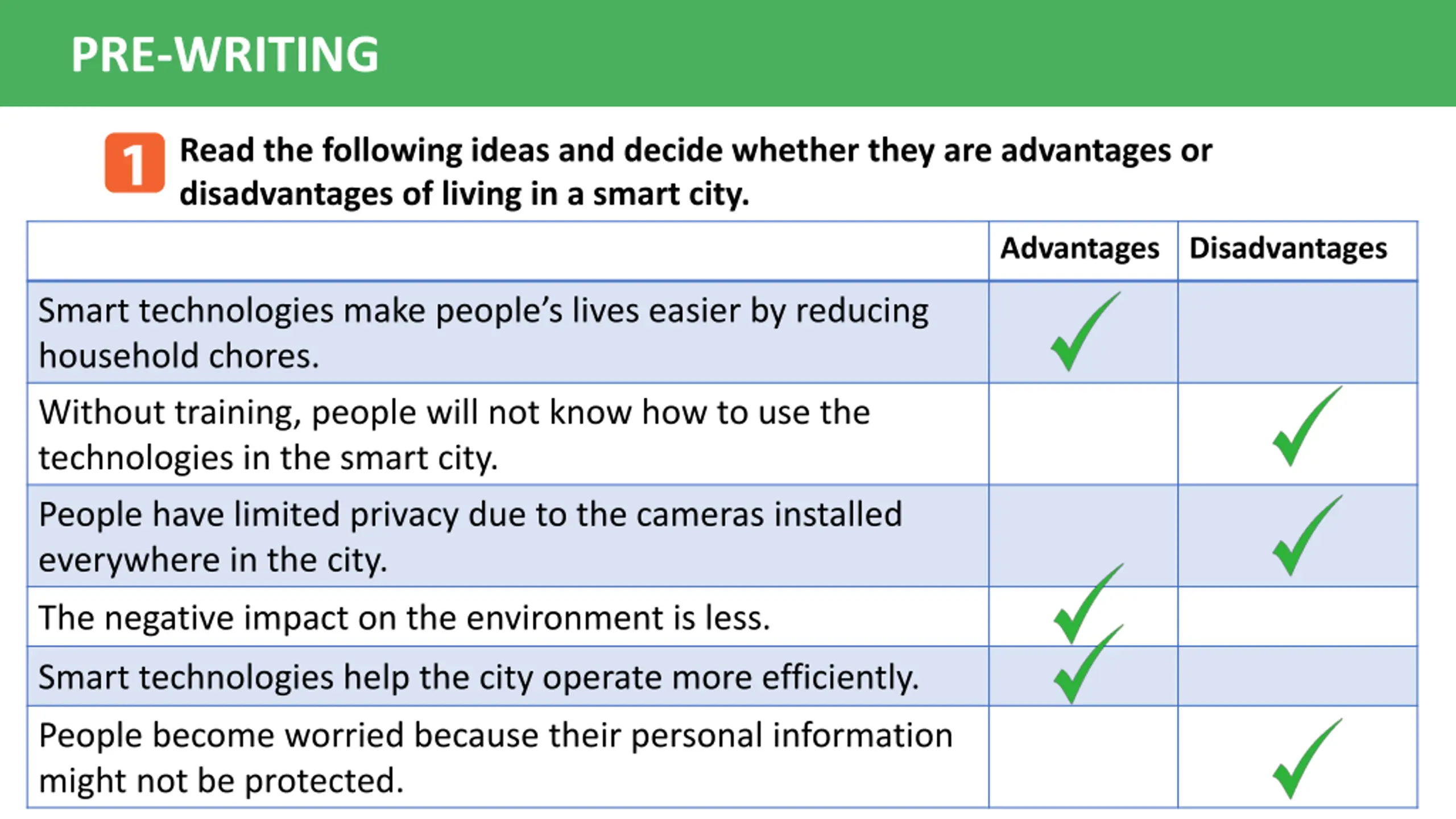 PRE-WRITING Read the following ideas and decide whether they are advantages or disadvantages of living in a smart city. Advantages Disadvantages Smart technologies make people s lives easier by reducing household chores. Without training, people will not know how to use the technologies in the smart city. People have limited privacy due to the cameras installed everywhere in the city. The negative impact on the environment is less. Smart technologies help the city operate more efficiently. People become worried because their personal information might not be protected.