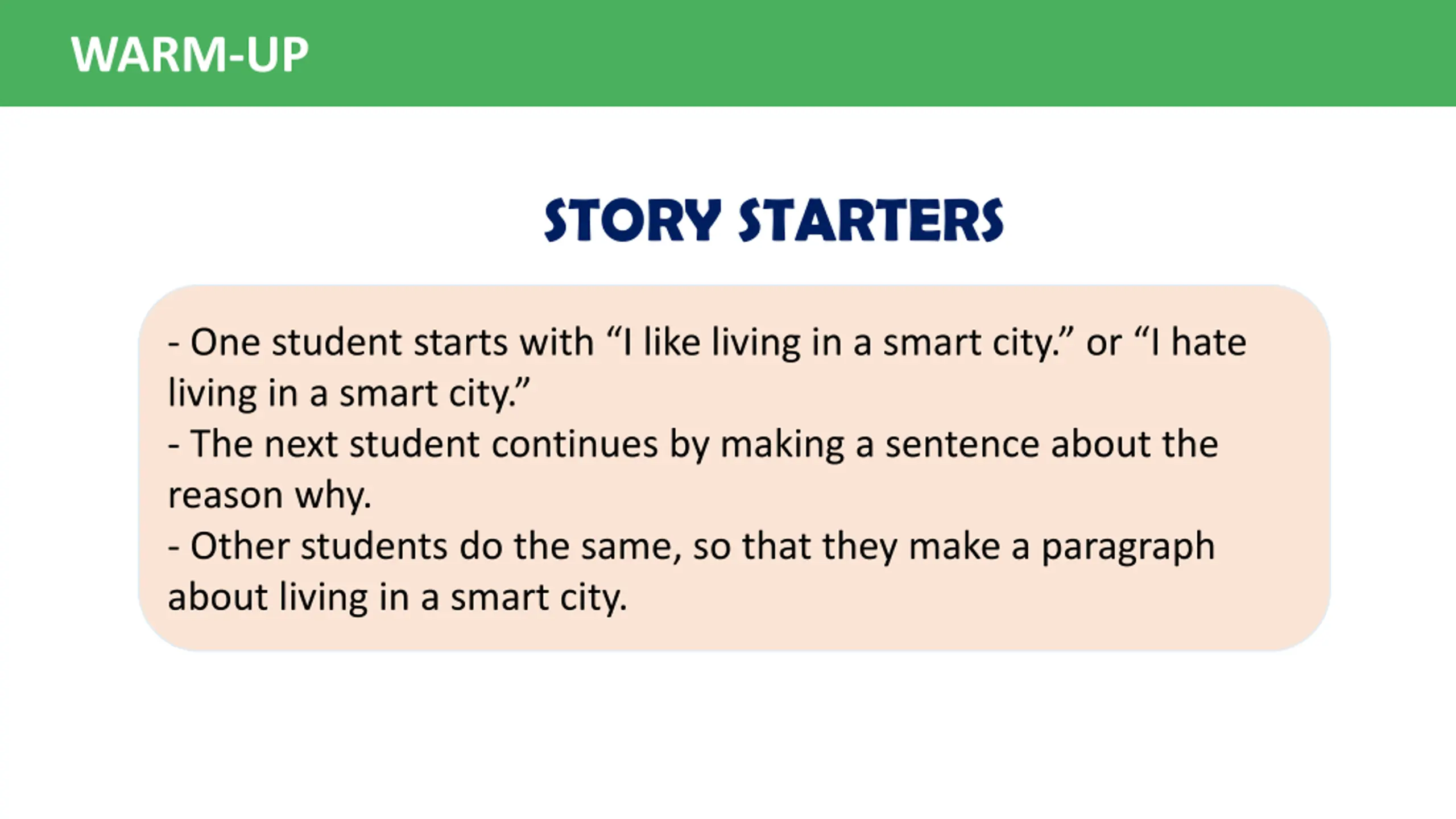 WARM-UP STORY STARTERS - One student starts with I like living in a smart city. or I hate living in a smart city. - The next student continues by making a sentence about the reason why. - Other students do the same, so that they make a paragraph about living in a smart city.