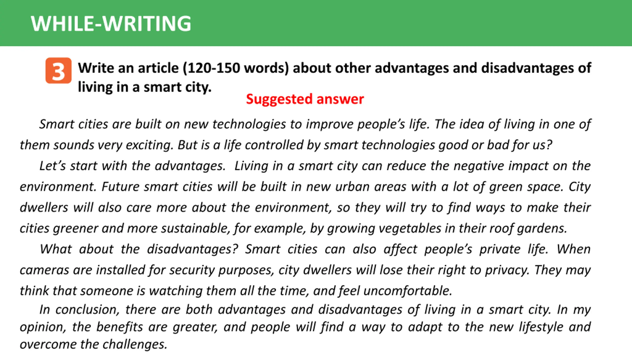 WHILE-WRITING Write an article (120-150 words) about other advantages and disadvantages of living in a smart city. Suggested answer Smart cities are built on new technologies to improve people s life. The idea of living in one of them sounds very exciting. But is a life controlled by smart technologies good or bad for us? Let s start with the advantages. Living in a smart city can reduce the negative impact on the environment. Future smart cities will be built in new urban areas with a lot of green space. City dwellers will also care more about the environment, so they will try to find ways to make their cities greener and more sustainable, for example, by growing vegetables in their roof gardens. What about the disadvantages? Smart cities can also affect people s private life. When cameras are installed for security purposes, city dwellers will lose their right to privacy. They may think that someone is watching them all the time, and feel uncomfortable. In conclusion, there are both advantages and disadvantages of living in a smart city. In my opinion, the benefits are greater, and people will find a way to adapt to the new lifestyle and overcome the challenges.