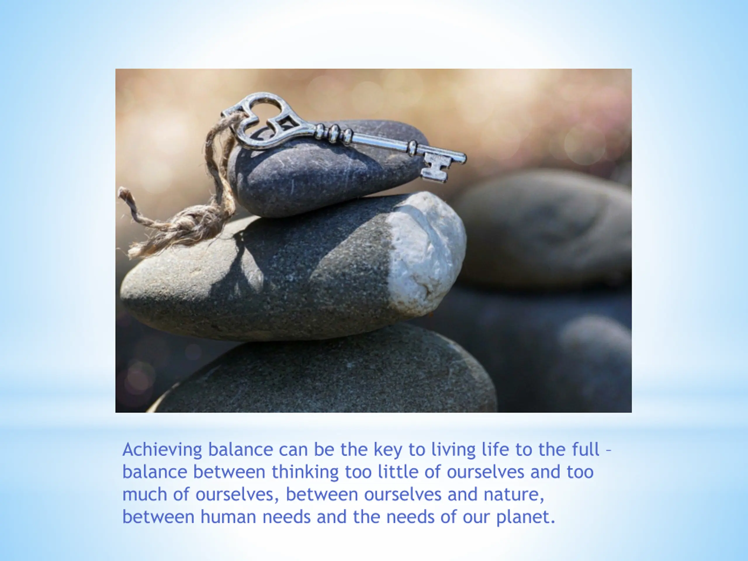 Achieving balance can be the key to living life to the full balance between thinking too little of ourselves and too much of ourselves, between ourselves and nature, between human needs and the needs of our planet.