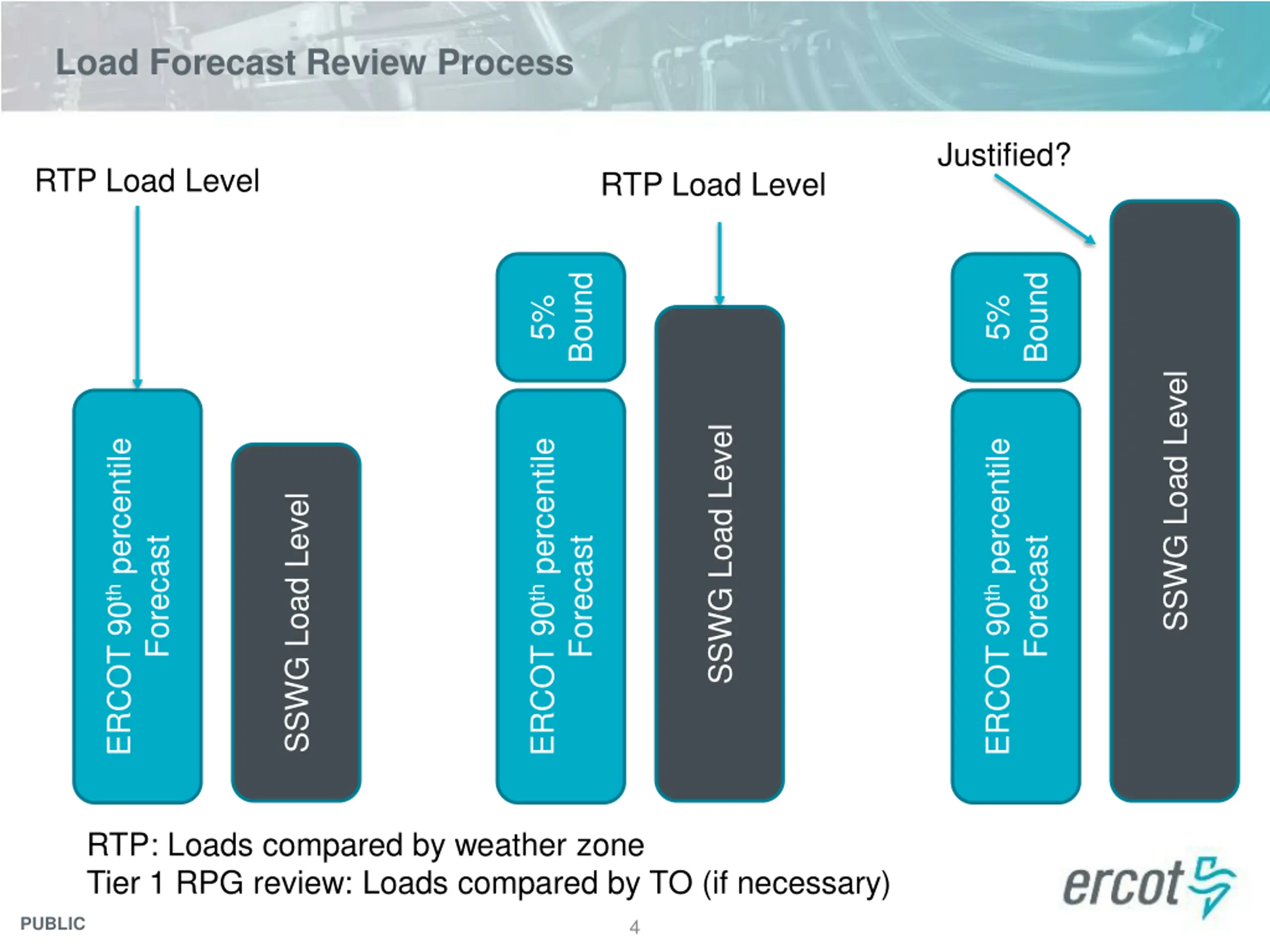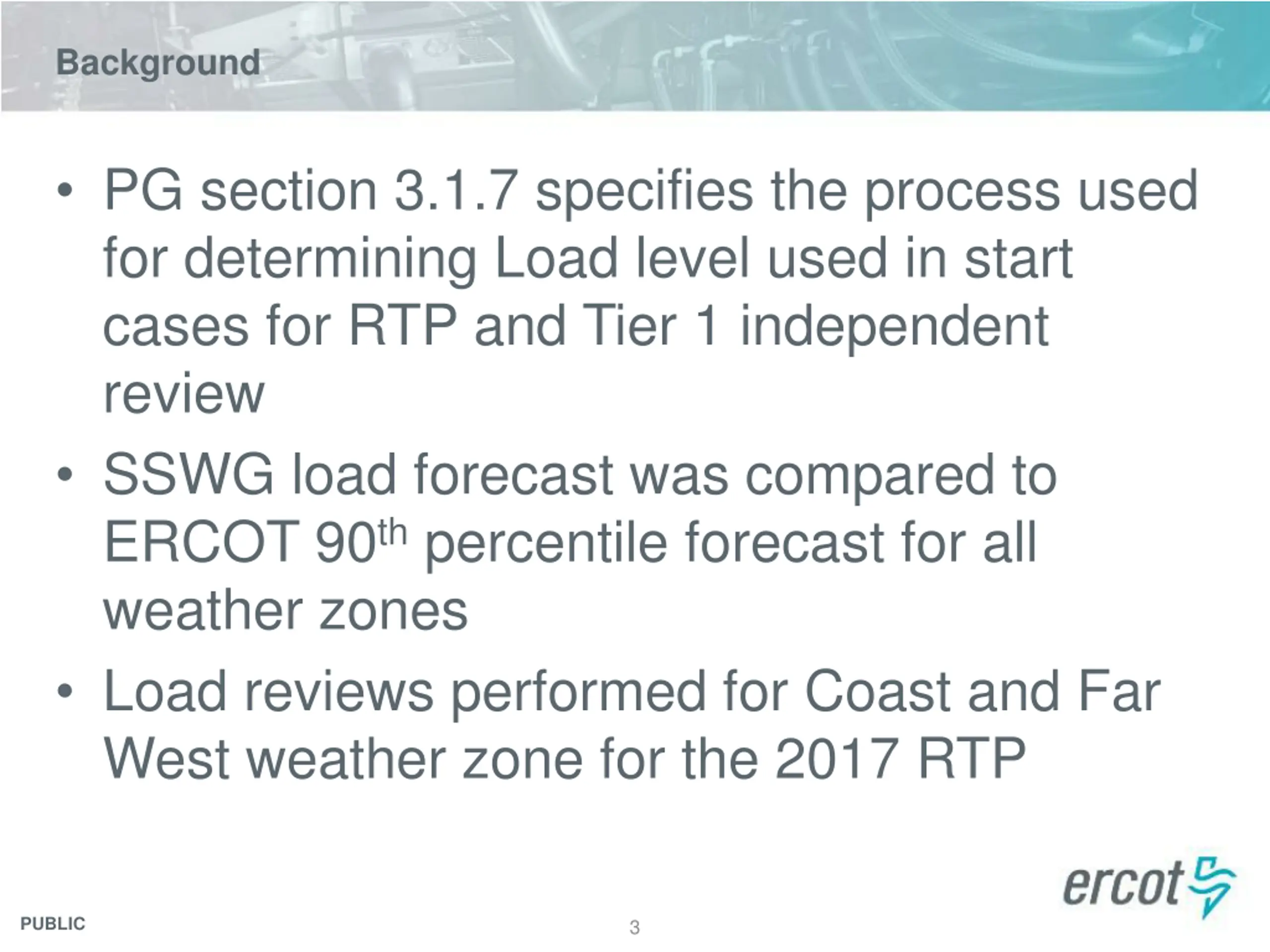 Background PG section 3.1.7 specifies the process used for determining Load level used in start cases for RTP and Tier 1 independent review SSWG load forecast was compared to ERCOT 90th percentile forecast for all weather zones Load reviews performed for Coast and Far West weather zone for the 2017 RTP PUBLIC 3