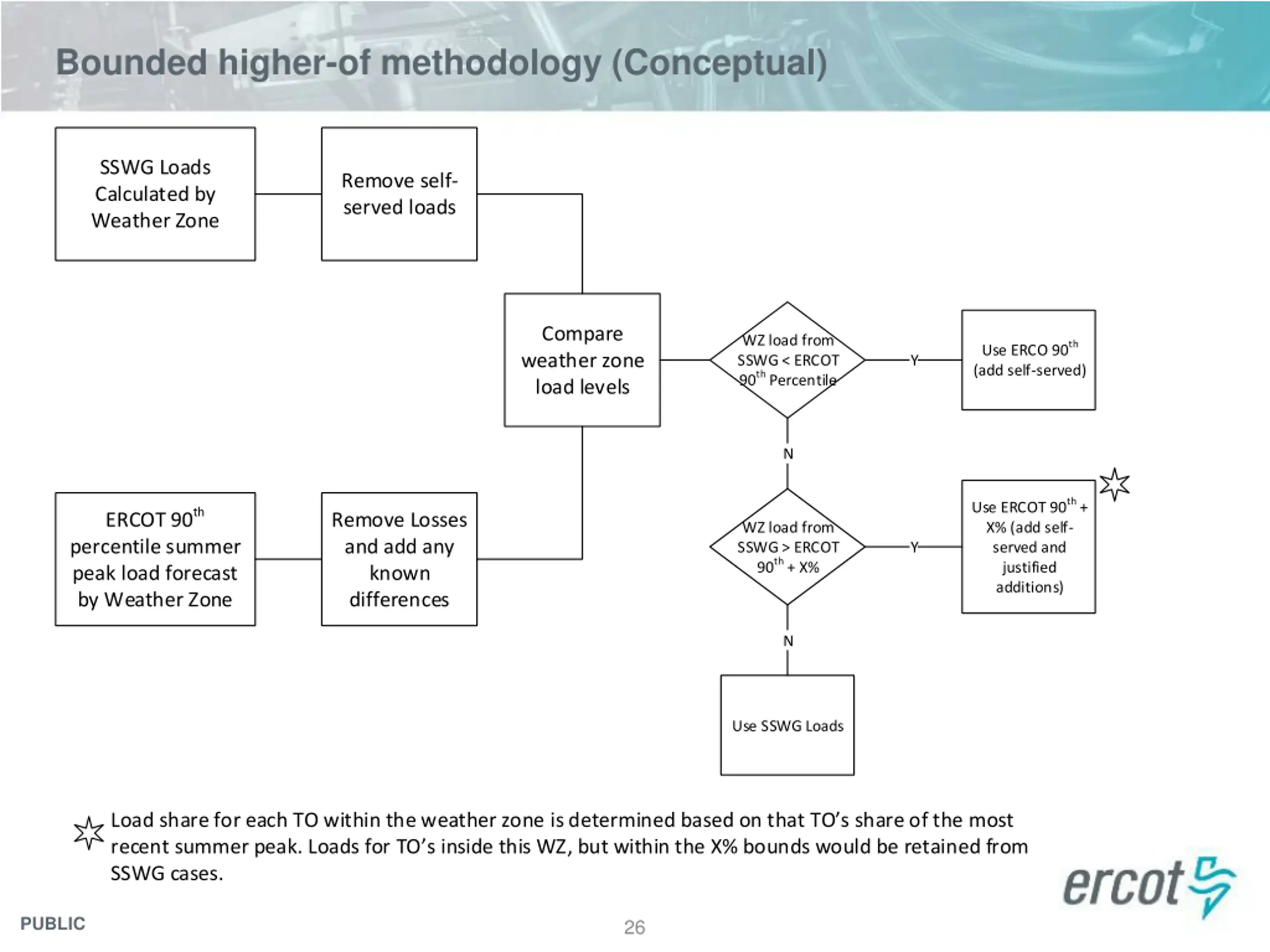 Bounded higher-of methodology (Conceptual) SSWG Loads Calculated by Weather Zone Remove self- served loads Compare weather zone load levels WZ load from SSWG < ERCOT 90th Percentile Use ERCO 90th (add self-served) Y N Use ERCOT 90th + X% (add self- served and justified additions) ERCOT 90th percentile summer peak load forecast by Weather Zone Remove Losses and add any known differences WZ load from SSWG > ERCOT 90th + X% Y N Use SSWG Loads Load share for each TO within the weather zone is determined based on that TO s share of the most recent summer peak. Loads for TO s inside this WZ, but within the X% bounds would be retained from SSWG cases. PUBLIC 26
