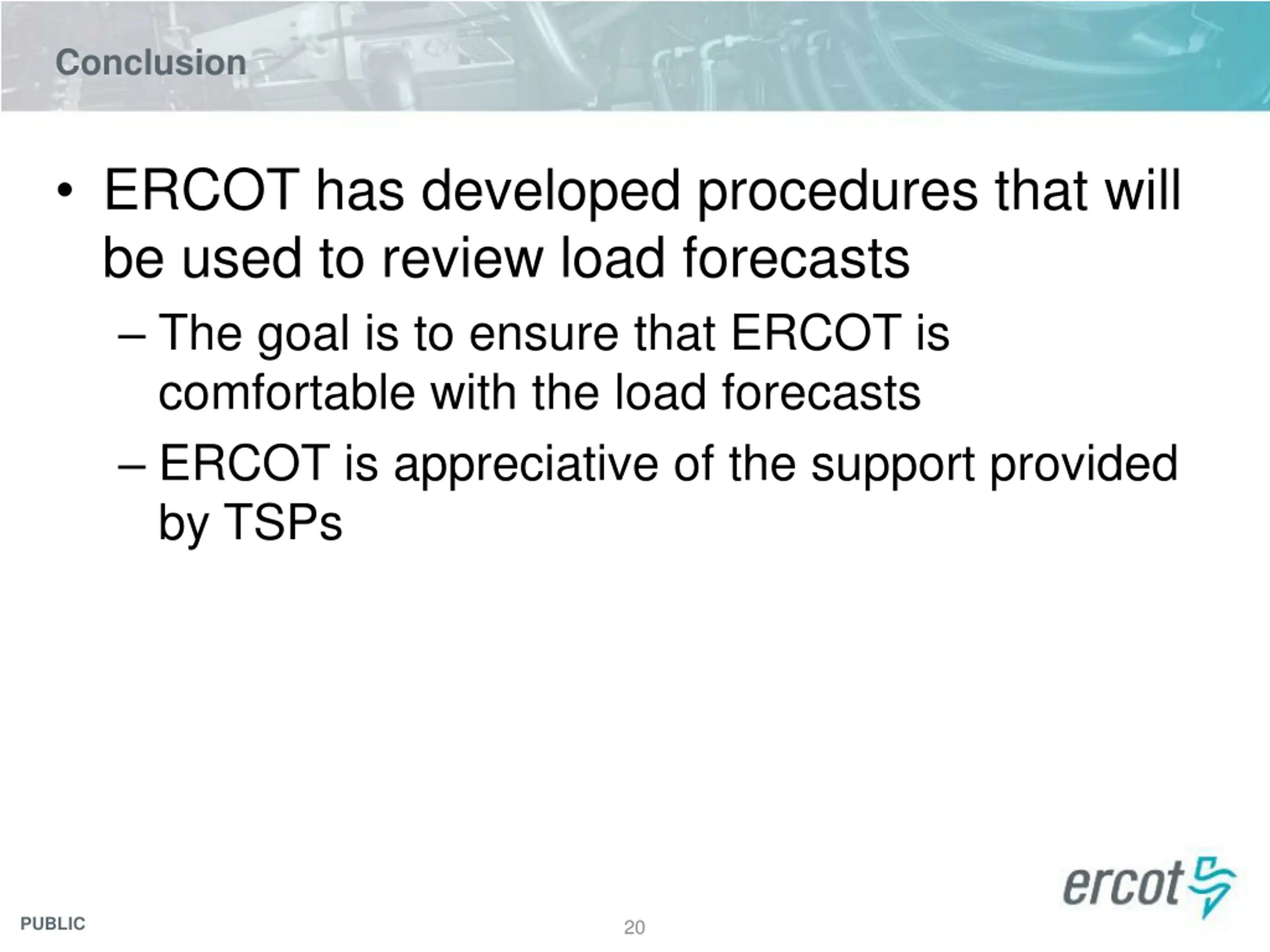 Conclusion ERCOT has developed procedures that will be used to review load forecasts The goal is to ensure that ERCOT is comfortable with the load forecasts ERCOT is appreciative of the support provided by TSPs PUBLIC 20