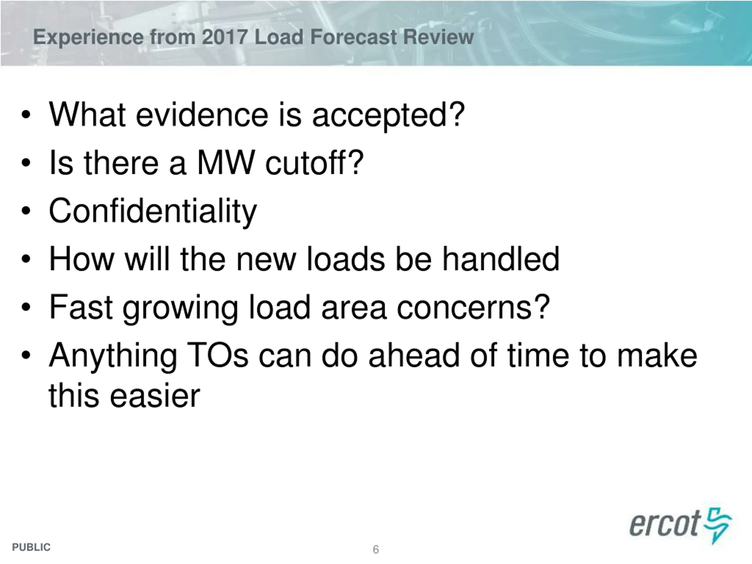 Experience from 2017 Load Forecast Review What evidence is accepted? Is there a MW cutoff? Confidentiality How will the new loads be handled Fast growing load area concerns? Anything TOs can do ahead of time to make this easier PUBLIC 6