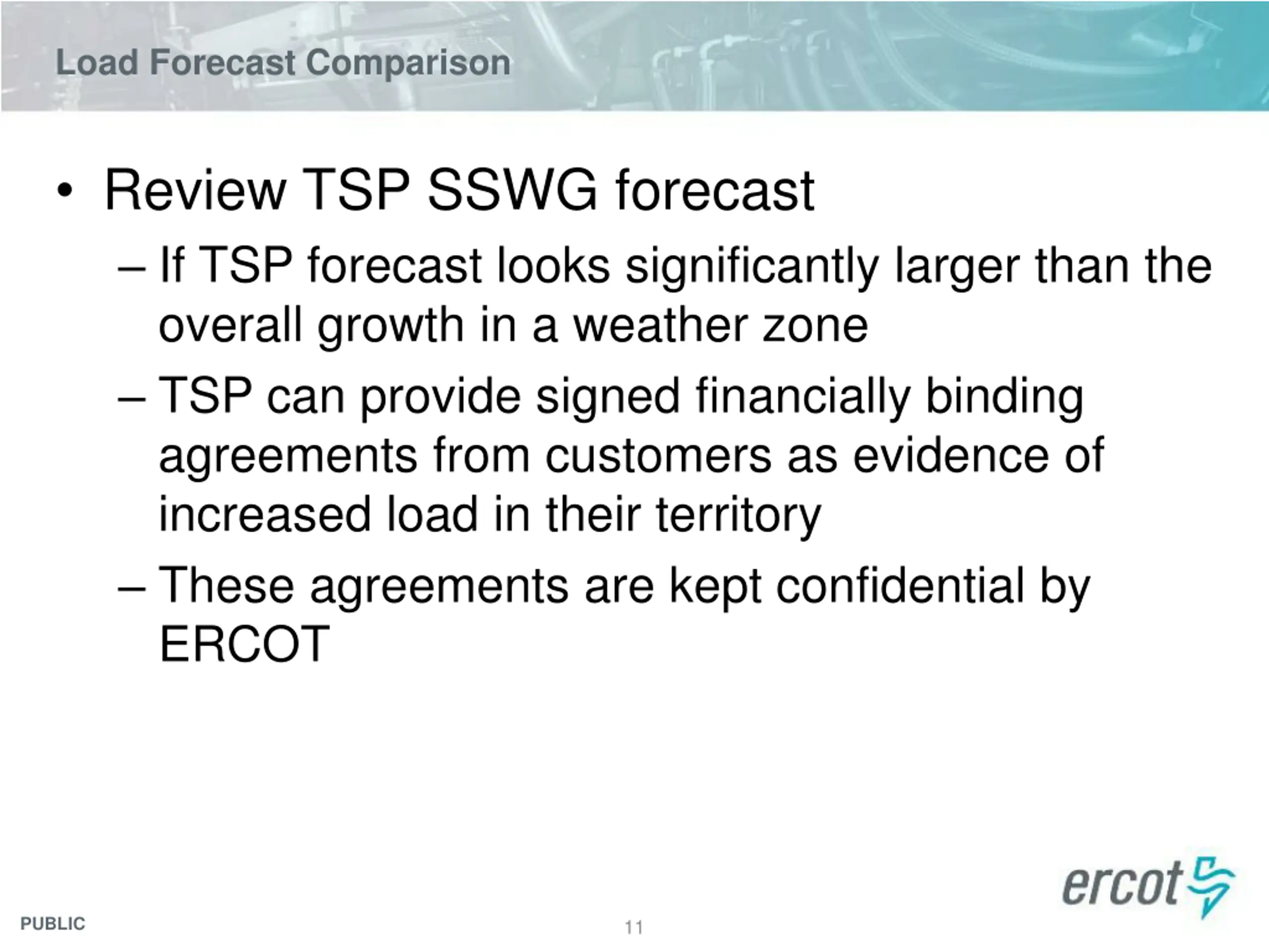 Load Forecast Comparison If Weather Zone SSWG forecast is higher than ERCOT 90th percentile forecast + 5% bound TSP can provide signed financially binding agreements from customers as evidence of increased load in their territory These agreements are kept confidential by ERCOT PUBLIC 10