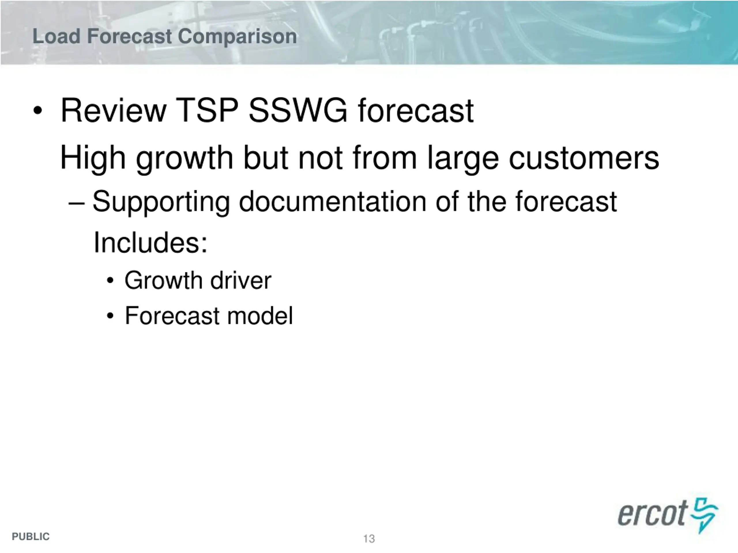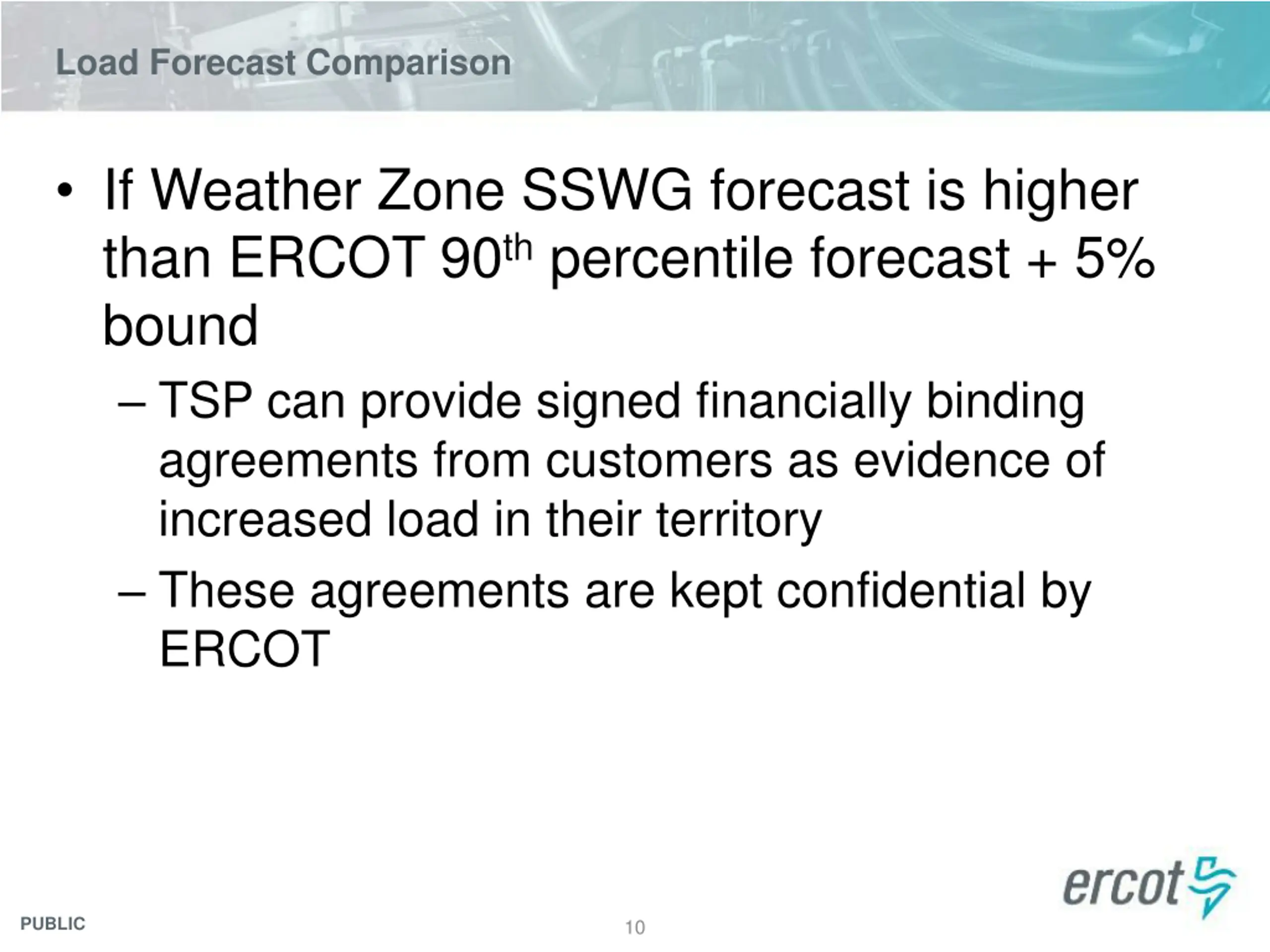 Load Forecast Comparison Review TSP SSWG forecast If TSP forecast looks significantly larger than the overall growth in a weather zone TSP can provide signed financially binding agreements from customers as evidence of increased load in their territory These agreements are kept confidential by ERCOT PUBLIC 11