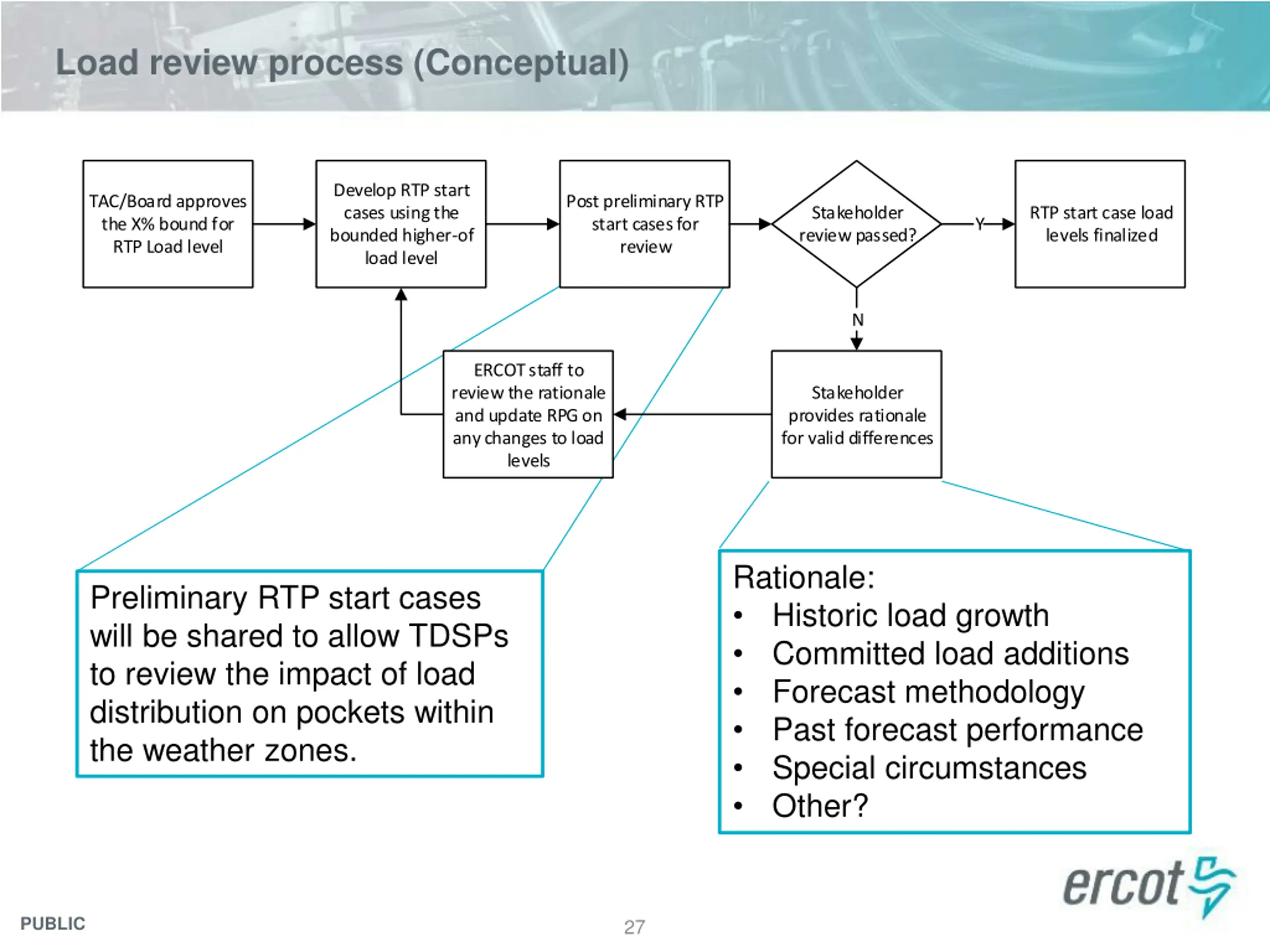 Load review process (Conceptual) Develop RTP start cases using the bounded higher-of load level TAC/Board approves the X% bound for RTP Load level Post preliminary RTP start cases for review Stakeholder review passed? RTP start case load levels finalized Y N ERCOT staff to review the rationale and update RPG on any changes to load levels Stakeholder provides rationale for valid differences Rationale: Historic load growth Committed load additions Forecast methodology Past forecast performance Special circumstances Other? Preliminary RTP start cases will be shared to allow TDSPs to review the impact of load distribution on pockets within the weather zones. PUBLIC 27