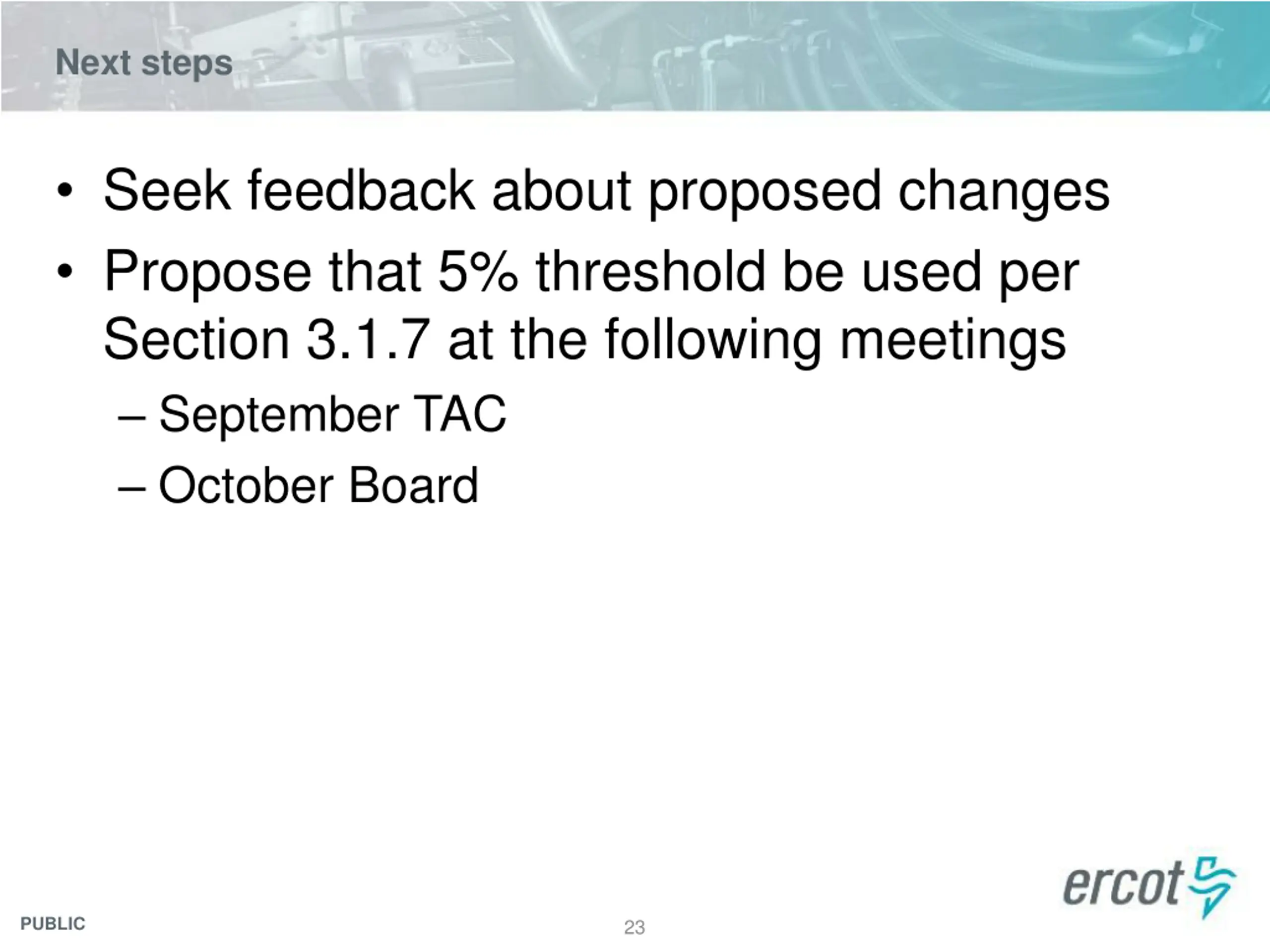 Next steps Seek feedback about proposed changes Propose that 5% threshold be used per Section 3.1.7 at the following meetings September TAC October Board PUBLIC 23