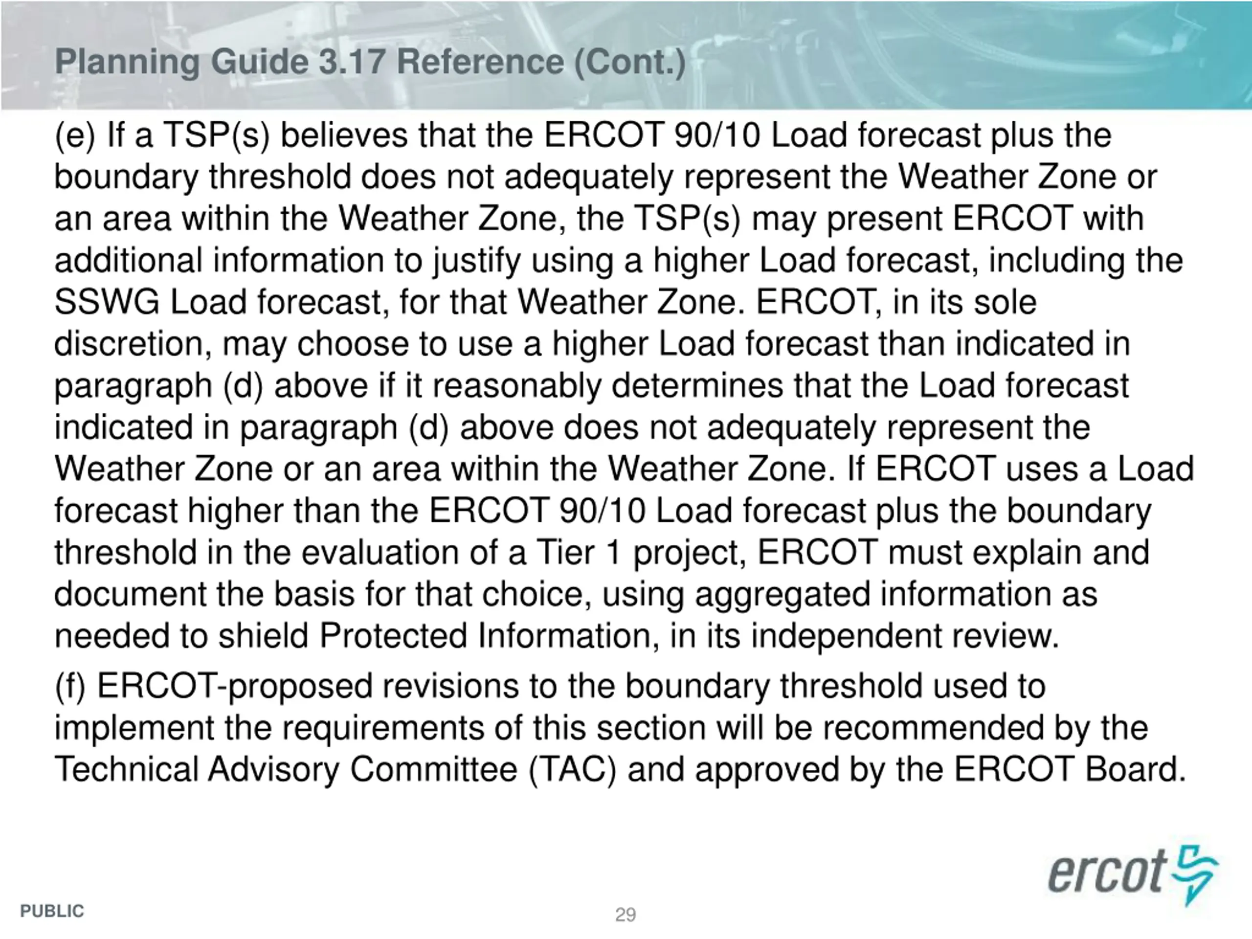 Planning Guide 3.17 Reference (Cont.) (e) If a TSP(s) believes that the ERCOT 90/10 Load forecast plus the boundary threshold does not adequately represent the Weather Zone or an area within the Weather Zone, the TSP(s) may present ERCOT with additional information to justify using a higher Load forecast, including the SSWG Load forecast, for that Weather Zone. ERCOT, in its sole discretion, may choose to use a higher Load forecast than indicated in paragraph (d) above if it reasonably determines that the Load forecast indicated in paragraph (d) above does not adequately represent the Weather Zone or an area within the Weather Zone. If ERCOT uses a Load forecast higher than the ERCOT 90/10 Load forecast plus the boundary threshold in the evaluation of a Tier 1 project, ERCOT must explain and document the basis for that choice, using aggregated information as needed to shield Protected Information, in its independent review. (f) ERCOT-proposed revisions to the boundary threshold used to implement the requirements of this section will be recommended by the Technical Advisory Committee (TAC) and approved by the ERCOT Board. PUBLIC 29