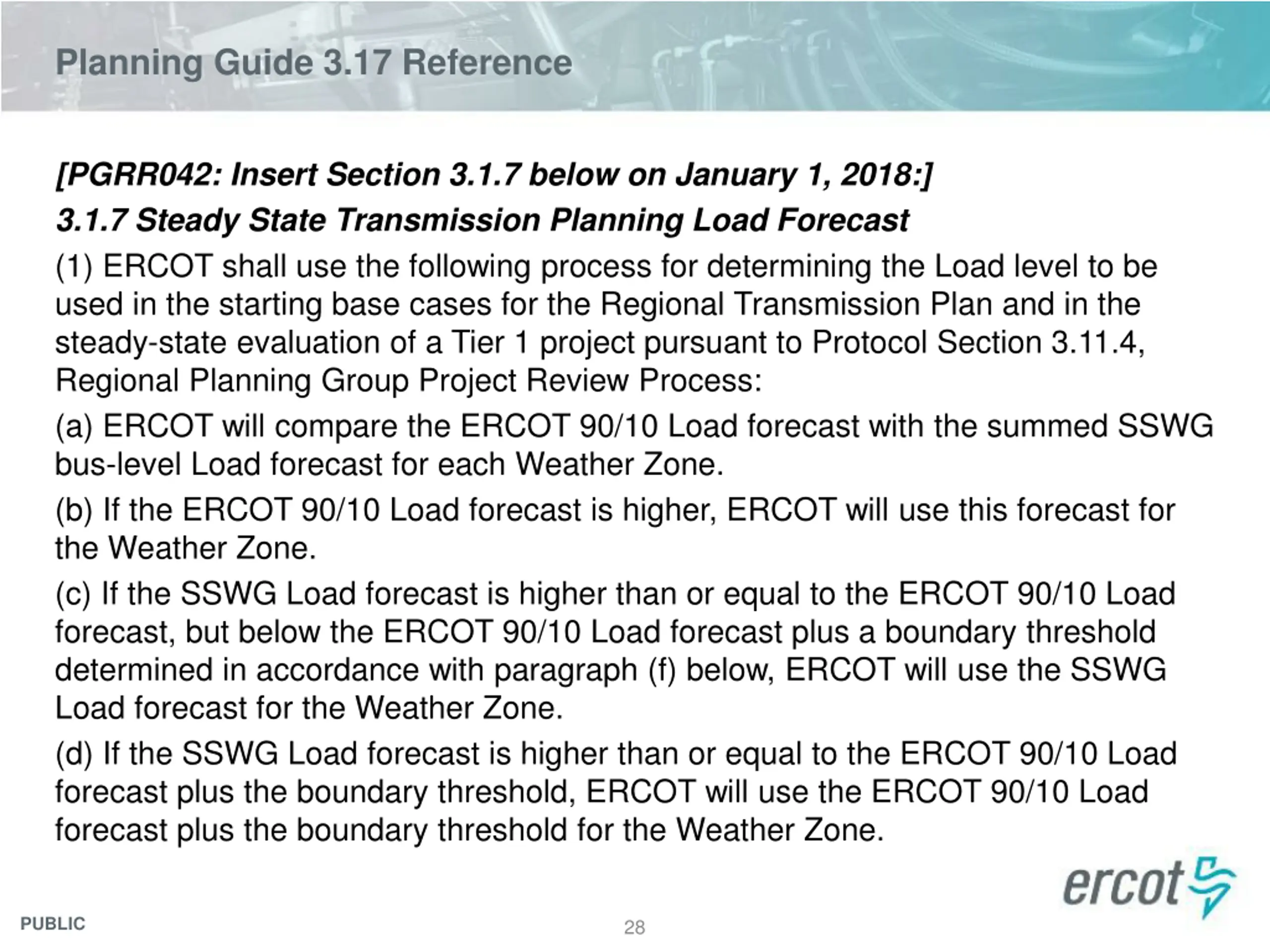 Planning Guide 3.17 Reference [PGRR042: Insert Section 3.1.7 below on January 1, 2018:] 3.1.7 Steady State Transmission Planning Load Forecast (1) ERCOT shall use the following process for determining the Load level to be used in the starting base cases for the Regional Transmission Plan and in the steady-state evaluation of a Tier 1 project pursuant to Protocol Section 3.11.4, Regional Planning Group Project Review Process: (a) ERCOT will compare the ERCOT 90/10 Load forecast with the summed SSWG bus-level Load forecast for each Weather Zone. (b) If the ERCOT 90/10 Load forecast is higher, ERCOT will use this forecast for the Weather Zone. (c) If the SSWG Load forecast is higher than or equal to the ERCOT 90/10 Load forecast, but below the ERCOT 90/10 Load forecast plus a boundary threshold determined in accordance with paragraph (f) below, ERCOT will use the SSWG Load forecast for the Weather Zone. (d) If the SSWG Load forecast is higher than or equal to the ERCOT 90/10 Load forecast plus the boundary threshold, ERCOT will use the ERCOT 90/10 Load forecast plus the boundary threshold for the Weather Zone. PUBLIC 28