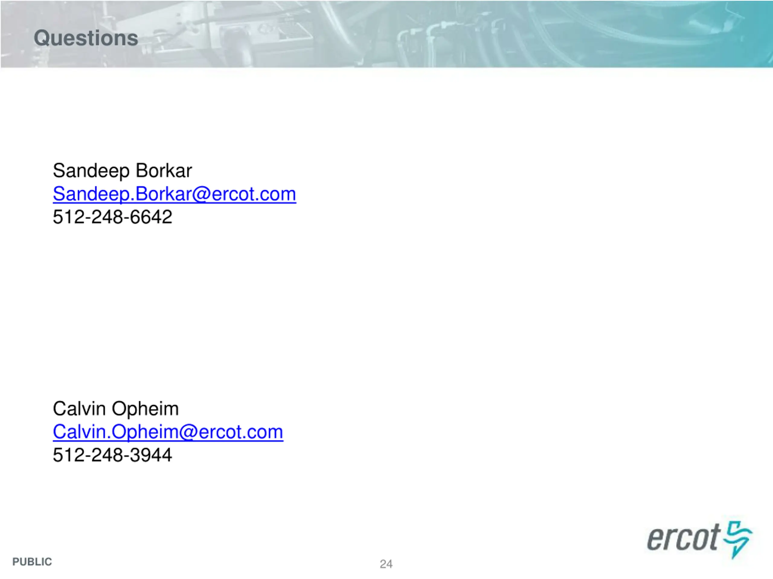 Questions Sandeep Borkar Sandeep.Borkar@ercot.com 512-248-6642 Calvin Opheim Calvin.Opheim@ercot.com 512-248-3944 PUBLIC 24