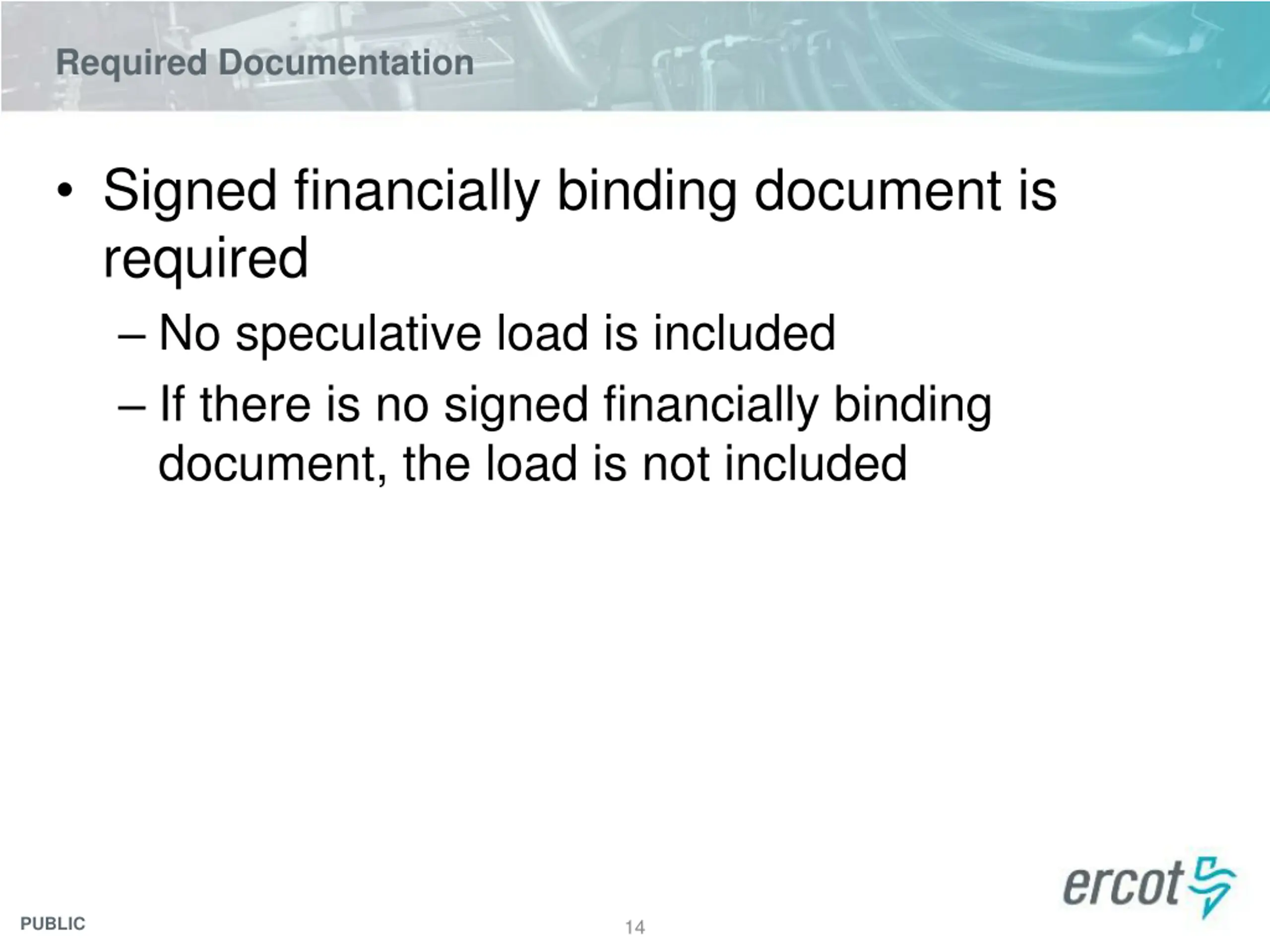 Required Documentation Signed financially binding document is required No speculative load is included If there is no signed financially binding document, the load is not included PUBLIC 14