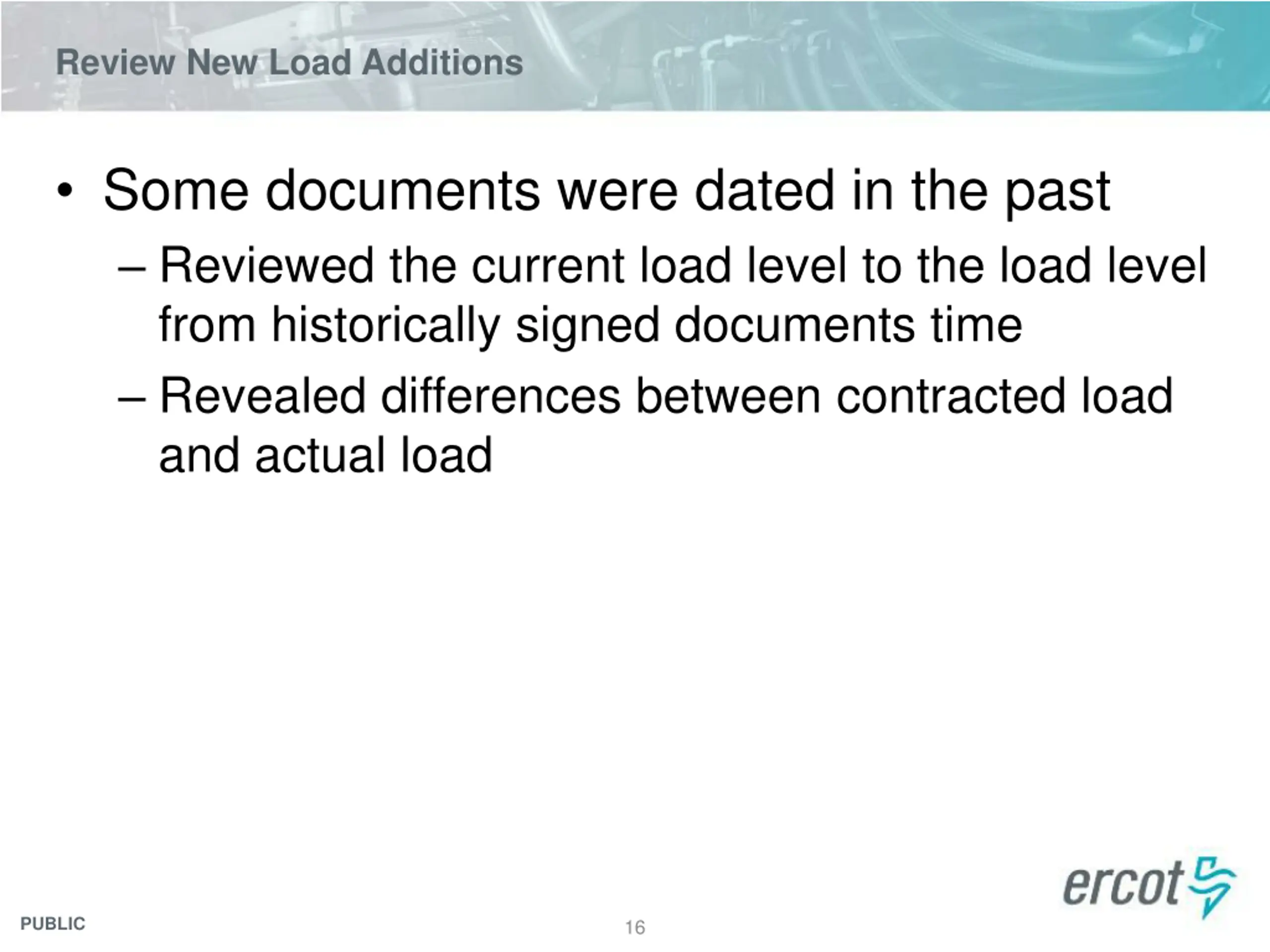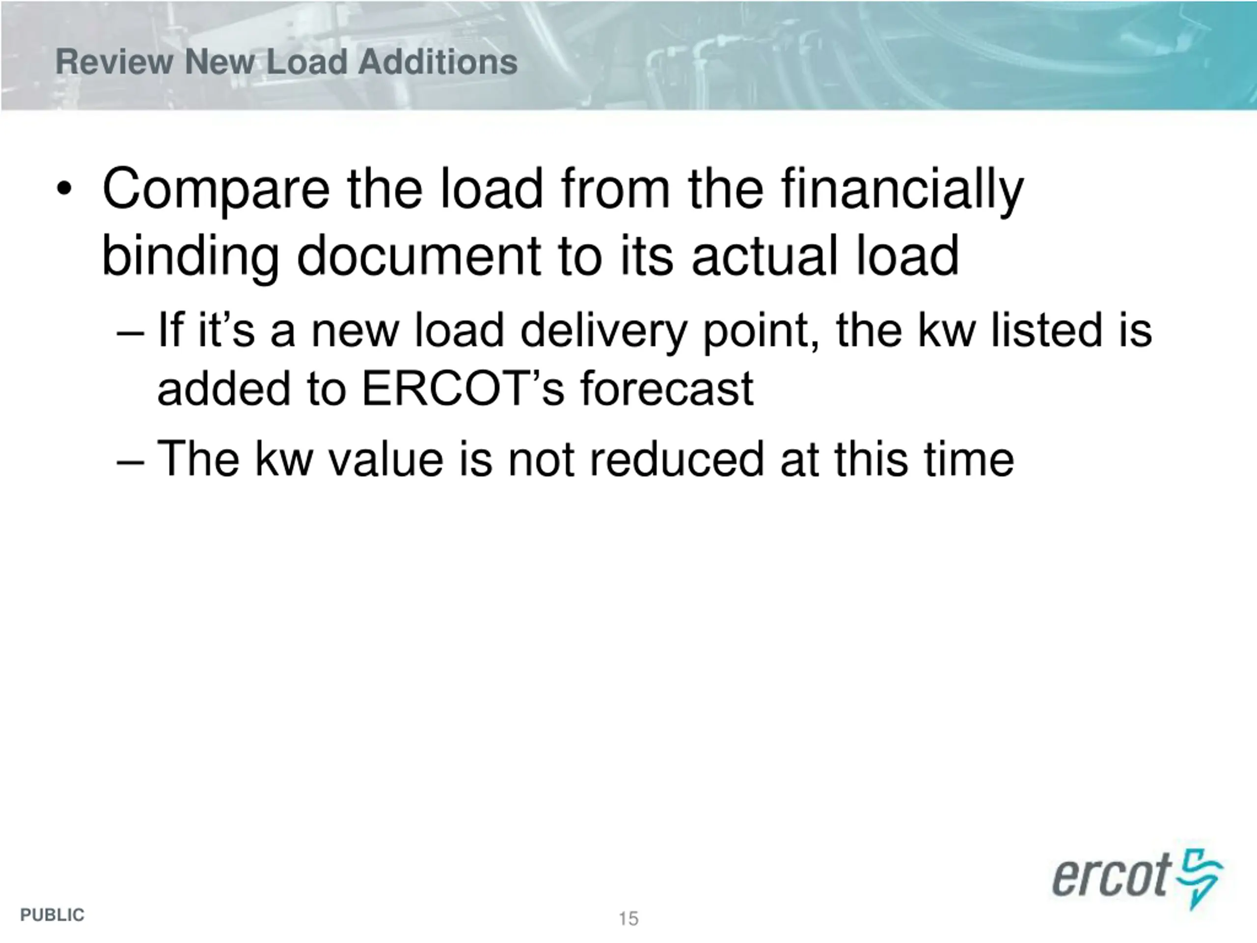 Review New Load Additions Compare the load from the financially binding document to its actual load If it s a new load delivery point, the kw listed is added to ERCOT s forecast The kw value is not reduced at this time PUBLIC 15