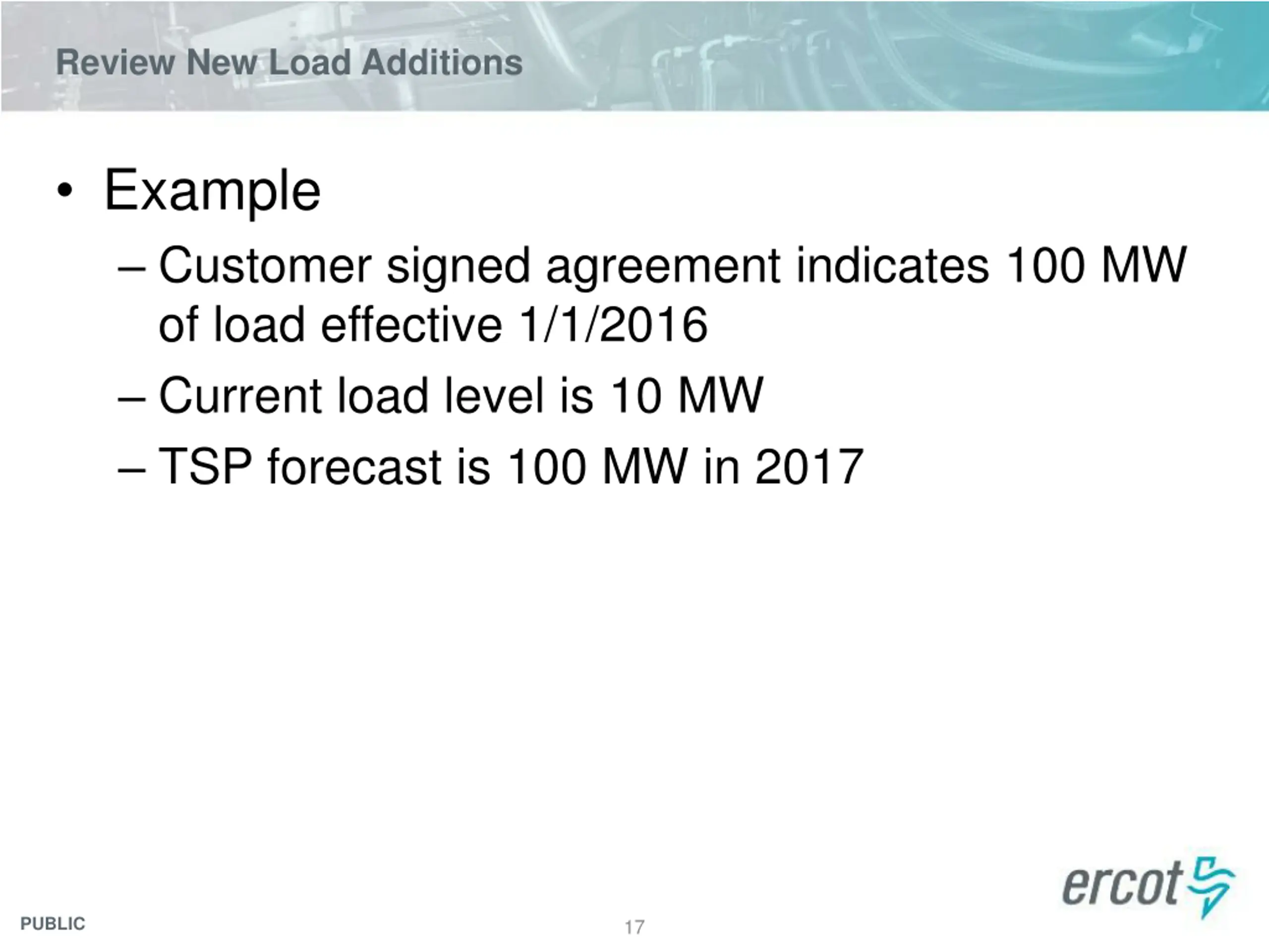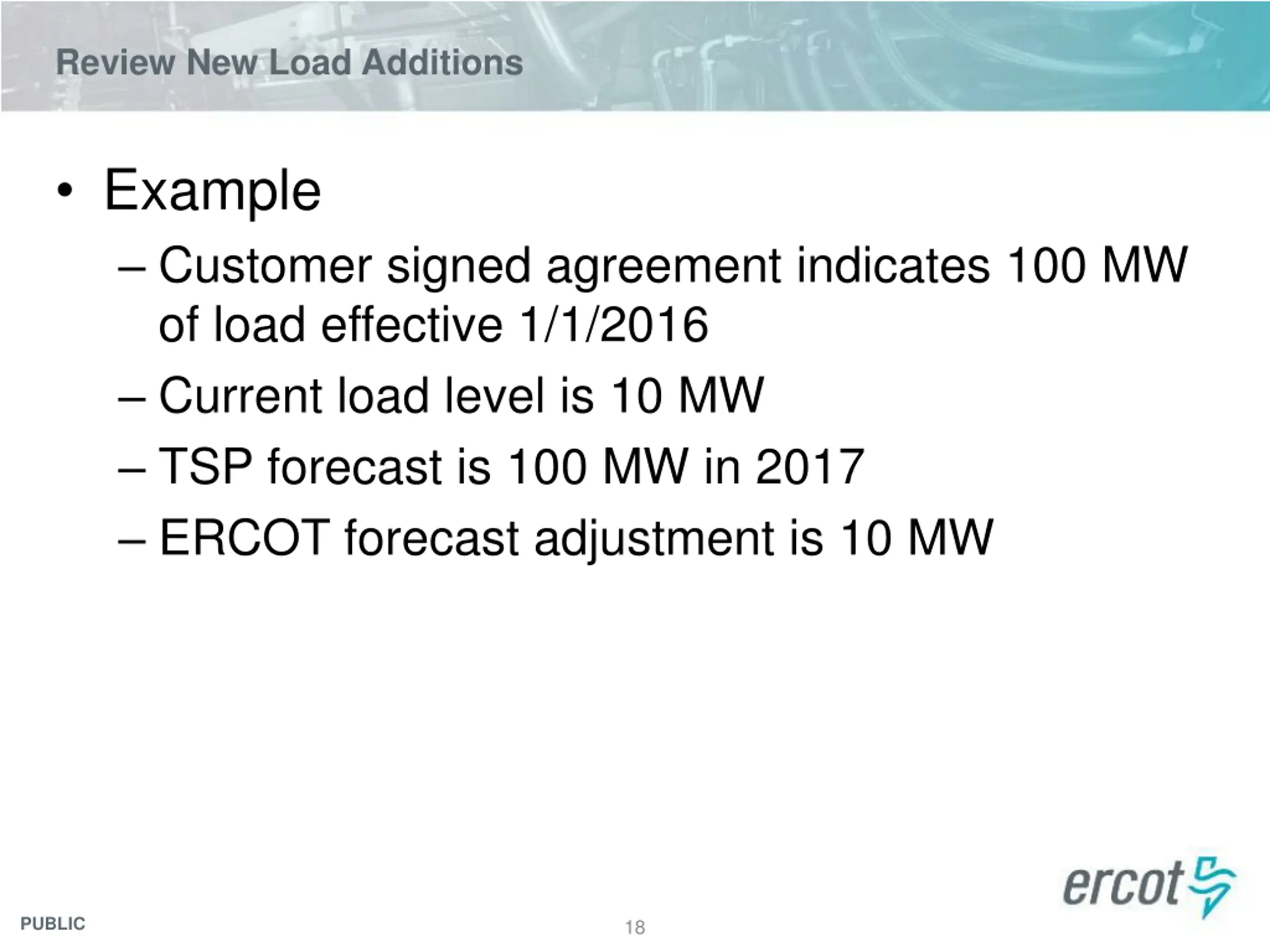 Review New Load Additions Example Customer signed agreement indicates 100 MW of load effective 1/1/2016 Current load level is 10 MW TSP forecast is 100 MW in 2017 PUBLIC 17