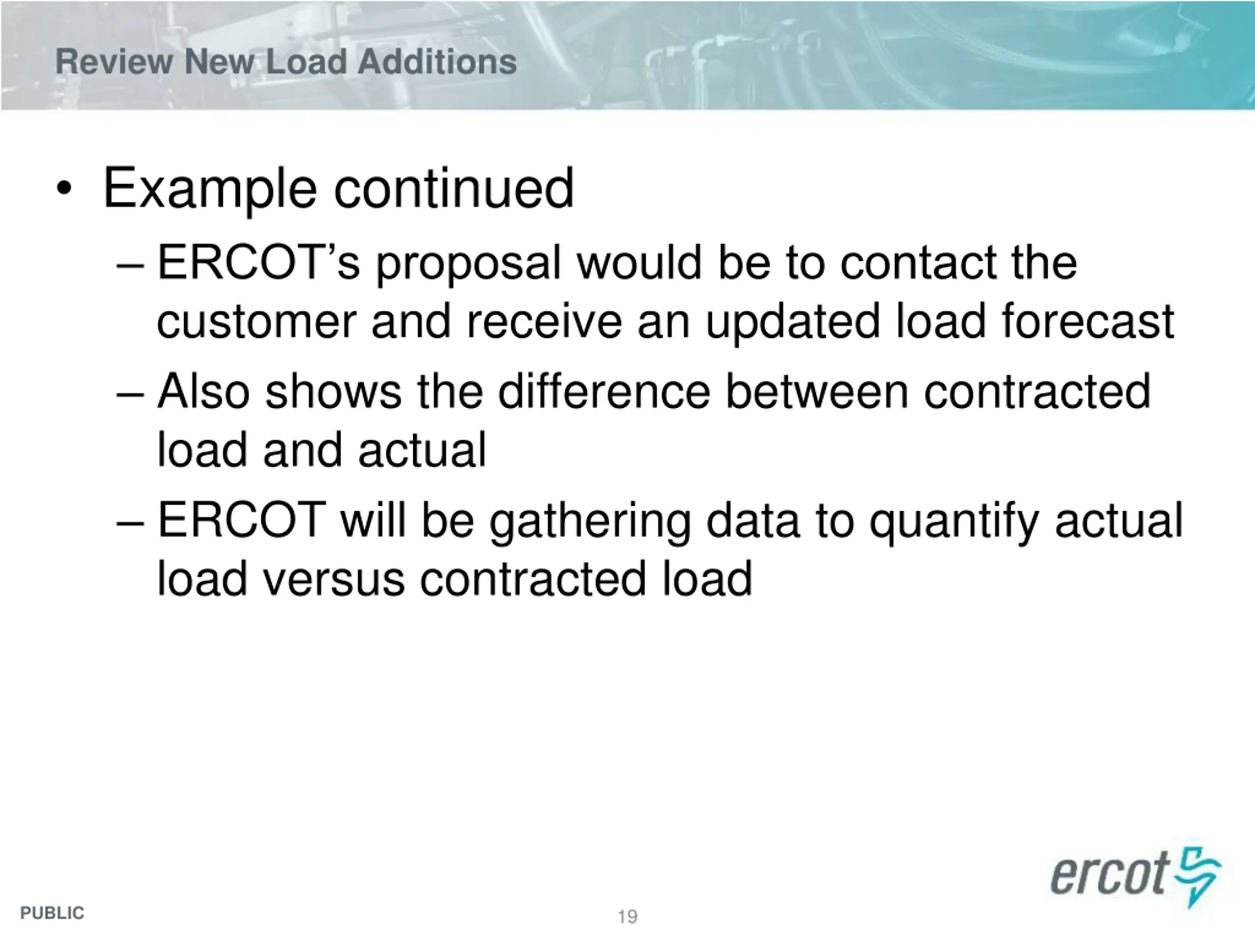 Review New Load Additions Example continued ERCOT s proposal would be to contact the customer and receive an updated load forecast Also shows the difference between contracted load and actual ERCOT will be gathering data to quantify actual load versus contracted load PUBLIC 19