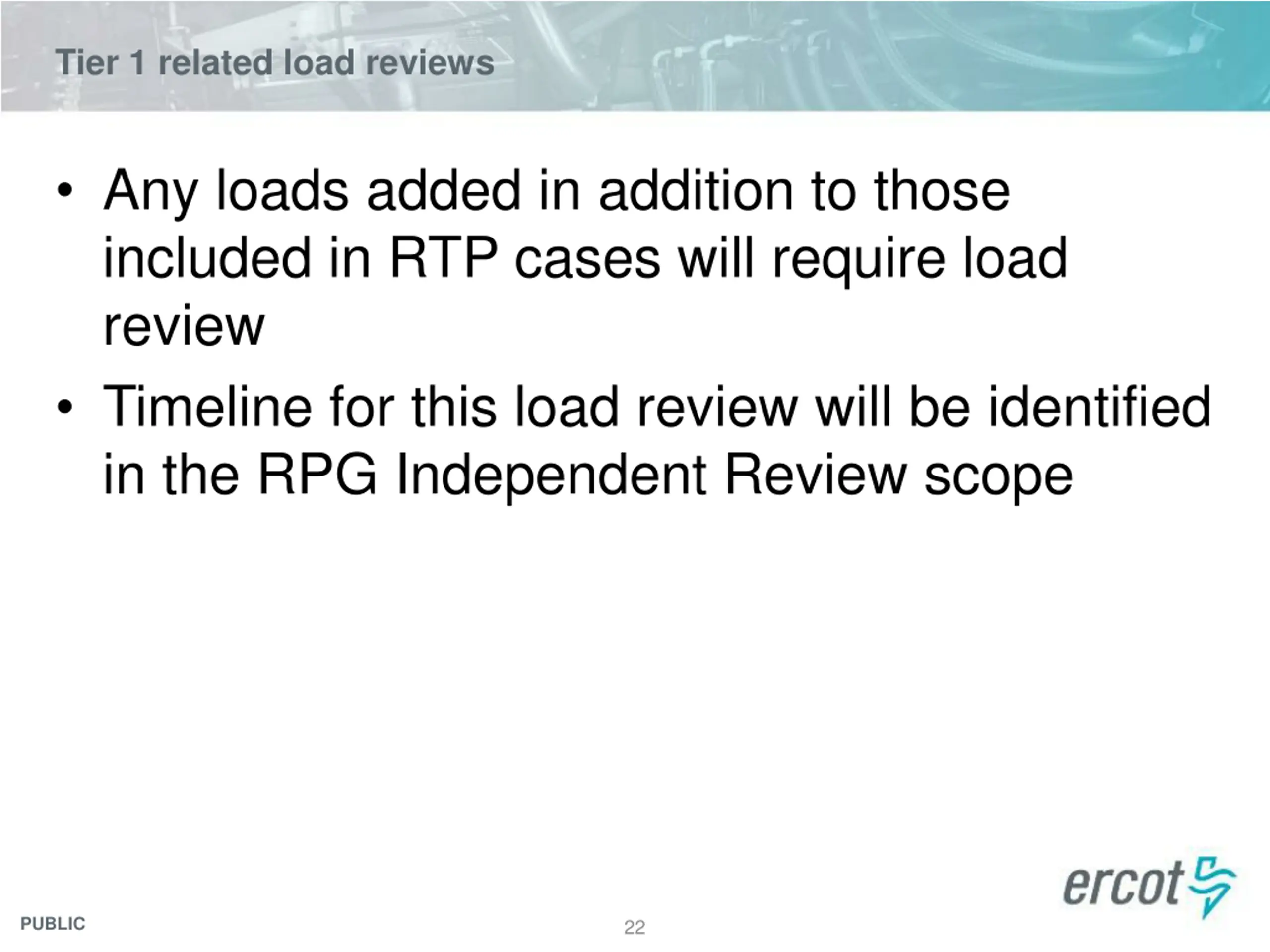 Tier 1 related load reviews Any loads added in addition to those included in RTP cases will require load review Timeline for this load review will be identified in the RPG Independent Review scope PUBLIC 22