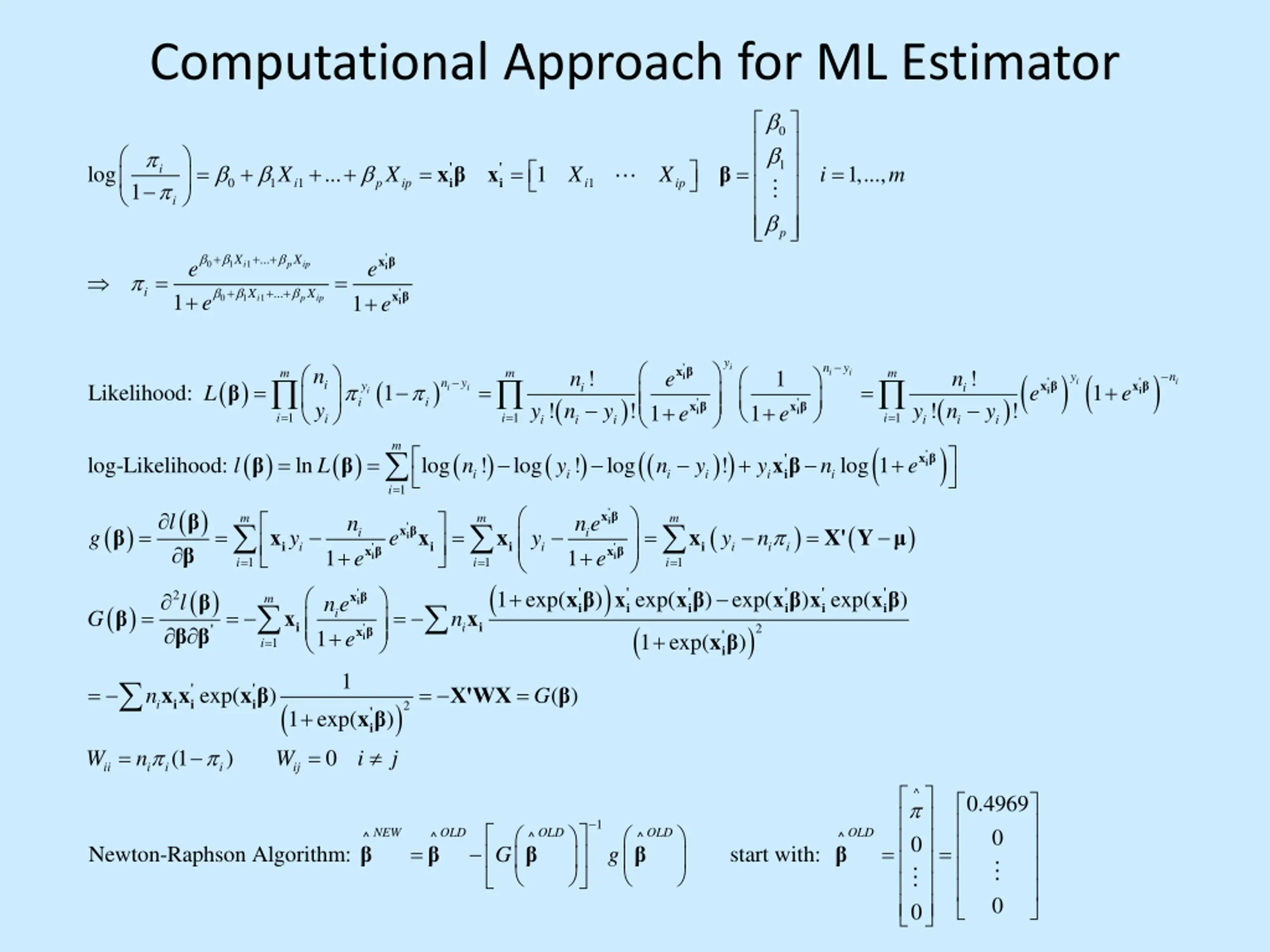Computational Approach for ML Estimator 0 1 = + + + = = = = ' i ' i x log ... 1 1,..., i X X X X i m x 0 1 1 1 i p ip i ip 1 i p + + + ' i ... X X x e + e + 0 1 1 i p ip = = + + + i ... X X ' i x 1 e 1 e 0 1 1 i p ip y n y ' i i )( ! ) ( ) n y x ! ! m m m n n 1 e n n e + i i y n ( ) ( ) n y ' i ' i i i i = = = + x y x Likelihood: 1 1 i i L e e i i i ( ) ( ) i i ' i ' i ! ! ! y y y y + x x 1 1 e = = = 1 1 1 i i i i i i i i i i ( m ( ) ( ) ( ) ( ) ( ) ( ) ' i = = + + x ' i log-Likelihood: ln log ! log ! log ! log 1 l L n y n y y n e x i i i i i i = 1 i ( ) ' i x l n ne + m m m ( ) ( ) ( ) ' i = = = = = x x x X' Y i i g y e y y n x x i i i i i i i i i ' i ' i + x x 1 1 e e = = = 1 1 1 i i i ( ) ( ) 1 exp( + ) exp( ' i ' i ' i ' i ' i ' i x x ) exp( ) exp( ) ' i x x x x 2 x l ne + m ( ) = = = i G n x x ( ) i i i ' 2 ' i x 1 e 1 exp( + ' i x ) = 1 i 1 = = = ' i ' i x x x exp( ) ( ) n G X'WX ( ) j i i 2 1 exp( + ' i x ) = = (1 ) 0 W n W i ii i i i ij ^ 0.4969 0 1 NEW OLD OLD OLD OLD ^ ^ ^ ^ ^ 0 = = = Newton-Raphson Algorithm: start with: G g 0 0