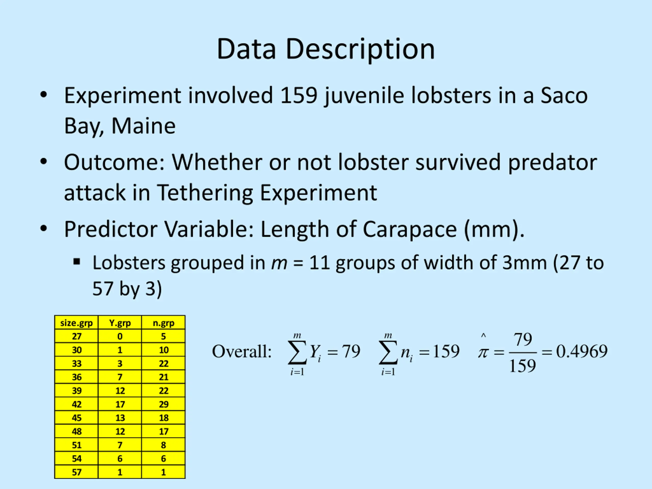 Data Description Experiment involved 159 juvenile lobsters in a Saco Bay, Maine Outcome: Whether or not lobster survived predator attack in Tethering Experiment Predictor Variable: Length of Carapace (mm). Lobsters grouped in m = 11 groups of width of 3mm (27 to 57 by 3) size.grp 27 30 33 36 39 42 45 48 51 54 57 Y.grp 0 1 3 7 12 17 13 12 7 6 1 n.grp 5 10 22 21 22 29 18 17 8 6 1 79 159 m m ^ = = = = Overall: 79 159 0.4969 Y n i i = = 1 1 i i