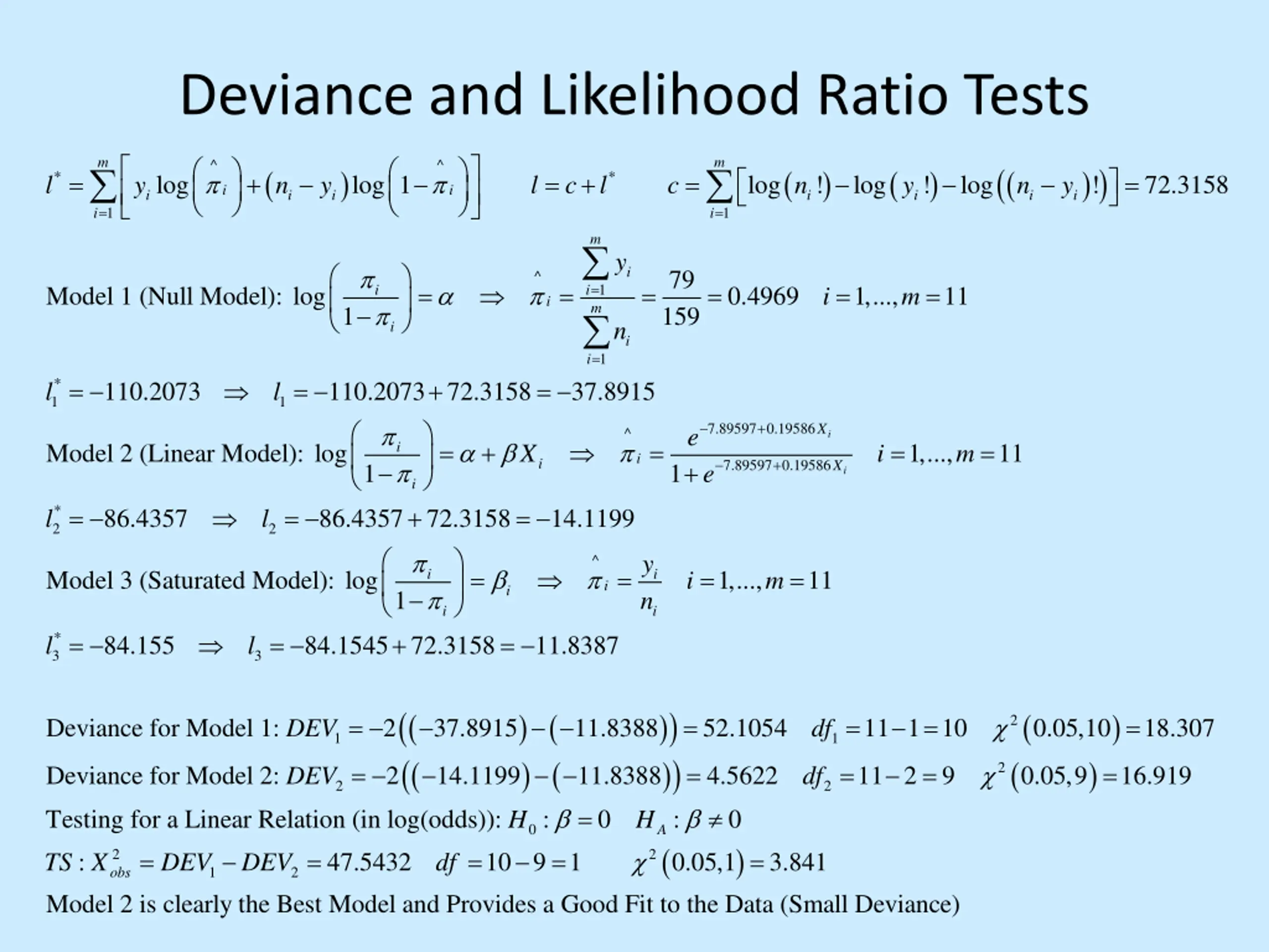 Deviance and Likelihood Ratio Tests m m ^ ^ ( ) ( ) ( ) ( ) ( ) = + c l = + = = * * log log 1 log ! log ! log ! 72.3158 l y n y l c n y n y i i i i i i i i i = = 1 1 i i m y = i 79 159 ^ = = = = = = Model 1 (Null Model): log 0.4969 1,..., 11 1 i i i m i m 1 n i i = 1 i 110.2073 = = .2073 72.3158 + = + + 37.8915 = * 1 110 l l 1 7.89597 0.19586 + X e + ^ i + = = = Model 2 (Linear Model): log 1,..., 11 i X i m i i 7.89597 0.19586 + X 1 1 e i i 86.4357 = = = * 2 86.4357 72.3158 14.1199 l l 2 = y n ^ = = = Model 3 (Saturated Model): log 1,..., 11 i i i m i i 1 i i 84.155 = = = * 3 84.1545 72.3158 11.8387 l l 3 ( ( ) ) : ( ( ) ( ) ( : H = ) ) ( ) = = = 11 1 10 = = 2 Deviance for Model 1: 2 37.8915 11.8388 52.1054 0.05,10 18.307 DEV df 1 1 ( ) = = = 11 2 = = 2 Deviance for Model 2: 2 14.1199 11.8388 = 4 .5622 9 0.05,9 16.919 DEV df 2 2 Testing for a Linear Relation (in log(odds)): = 0 0 H 0 A ( ) = = = 2 obs 2 : 47.5432 10 9 1 0.05,1 3.841 TS X DEV DEV df 1 2 Model 2 is clearly the Best Model and Provides a Good Fit to th e Data (Small Deviance)