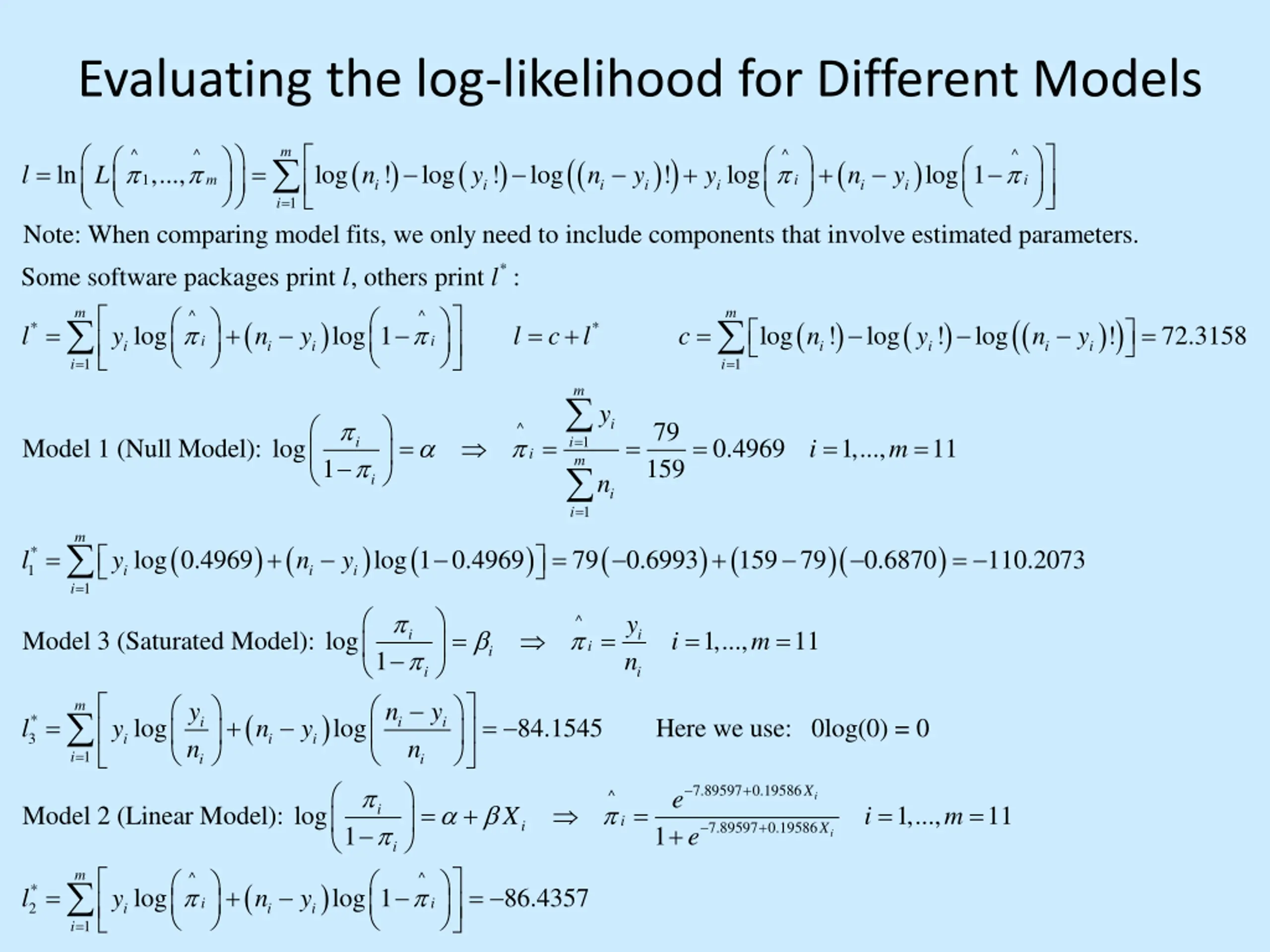 Evaluating the log-likelihood for Different Models m ^ ^ ^ ^ ( ) ( ) ( ) ( ) ( ) = = + + ln ,..., log ! log ! log ! log log 1 l L n y n y y n y 1 m i i i i i i i i i = 1 i Note: When comparing model fits, we only need to include components that involve estimated parameters. Some software packages print , others print : l l = + = + * m m ^ ^ ( ) ( ) ( ) ( ) ( ) = = * * log log 1 log ! log ! log ! 72.3158 l y n y l c l c n y n y i i i i i i i i i = = 1 1 i i m y = i 79 159 ^ = = = = = = m Model 1 (Null Model): log 0.4969 1,..., 11 1 i i i m i 1 n i i = 1 i m ( ) ( + ) ( ) ( ) ( + )( ) = log 1 0.4969 = 0.6993 159 79 0.6870 110.2073 = * 1 log 0.4969 79 l y n y i i i = 1 i = y n ^ = = = Model 3 (Saturated Model): log 1,..., 11 i i i m i i 1 i i n y n n y m ( ) = + 84.1545 Here we use: 0log(0) = 0 = * 3 log log i i i l y n y i i i = 1 i i i = 7.89597 0.19586 + X e + ^ i + = = = Model 2 (Linear Model): log 1,..., 11 i X i m i i 7.89597 0.19586 + X 1 1 e i i = m ^ ^ ( ) = + * 2 log log 1 86.4357 l y n y i i i i i i= 1