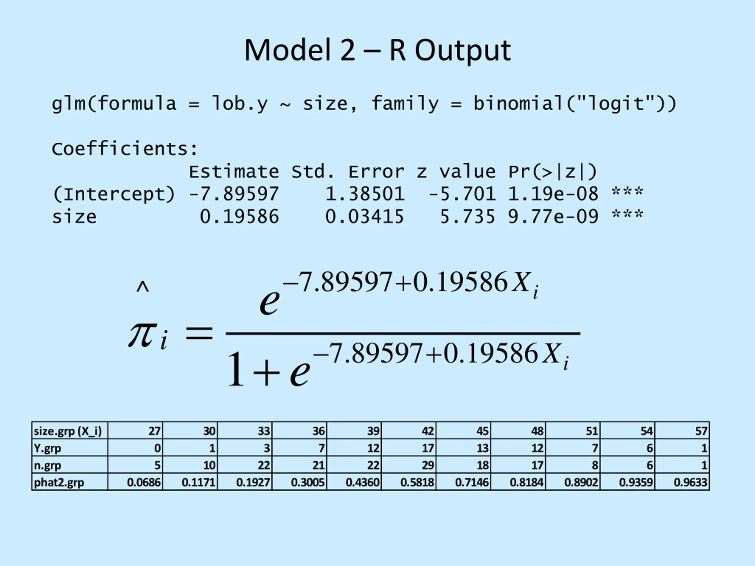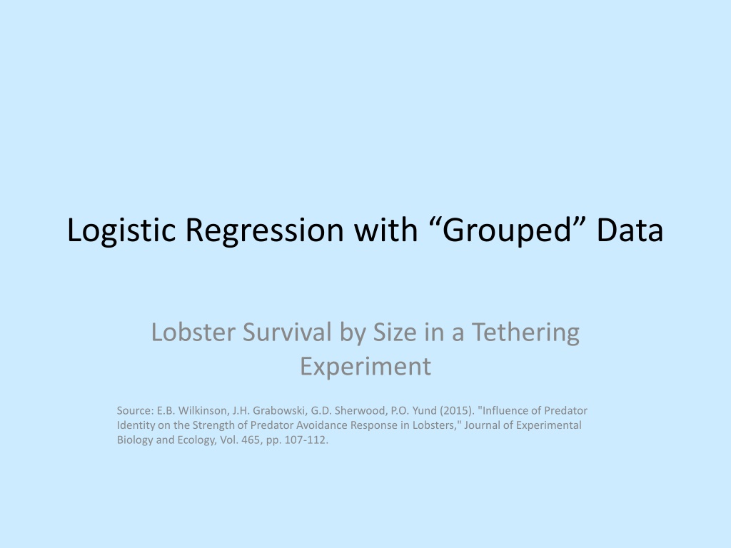 Logistic Regression with Grouped Data Lobster Survival by Size in a Tethering Experiment Source: E.B. Wilkinson, J.H. Grabowski, G.D. Sherwood, P.O. Yund (2015). "Influence of Predator Identity on the Strength of Predator Avoidance Response in Lobsters," Journal of Experimental Biology and Ecology, Vol. 465, pp. 107-112.
