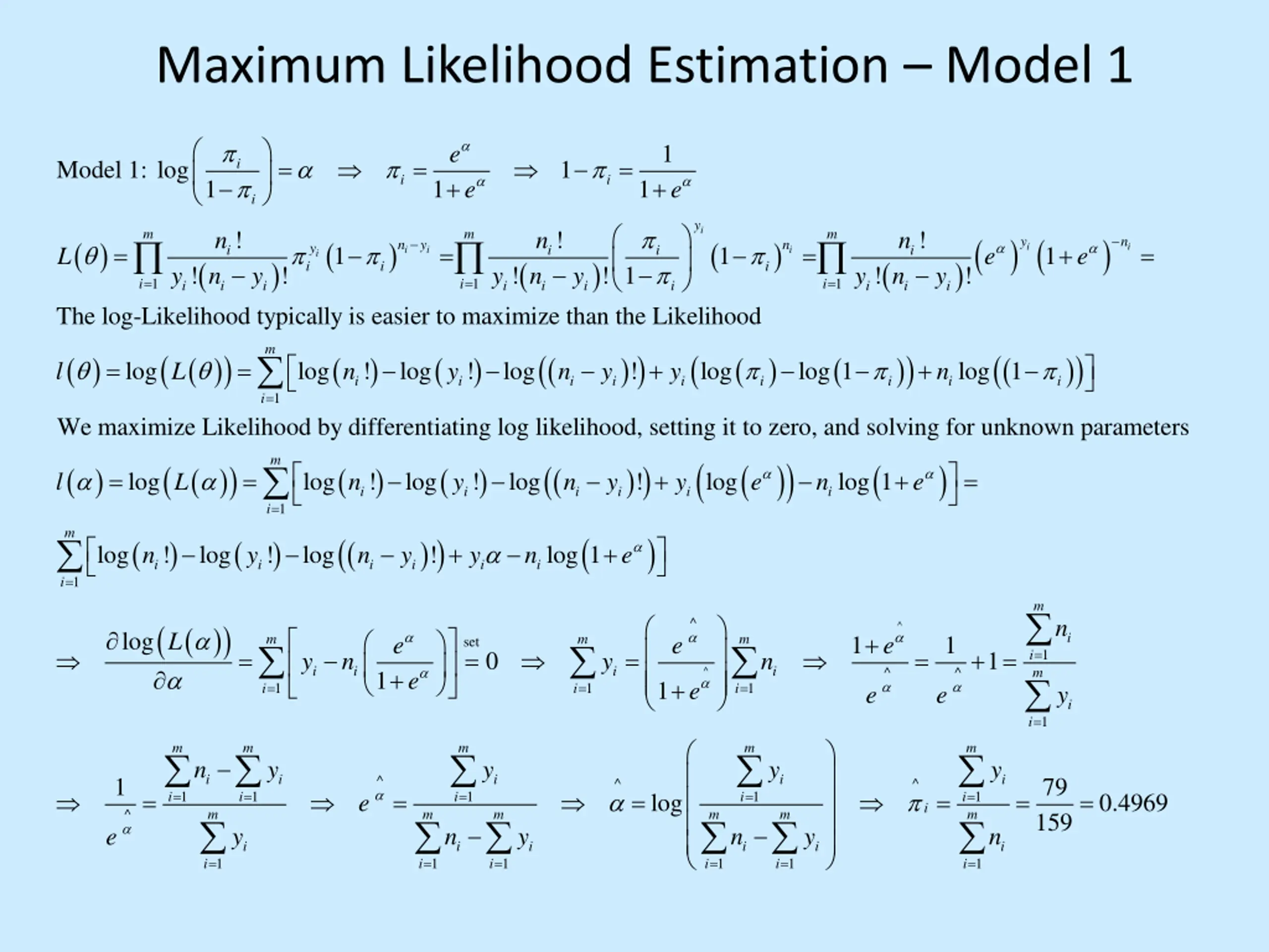 Maximum Likelihood Estimation Model 1 = 1 e + = = Model 1: log 1 i i i + 1 1 1 e e i y i ! ! ! m m m n n n n n n )( ) ( ! ) y n ( ) ( ) ( ) n y n = = = + = y i i 1 1 1 i i i i L e e i i i i ( ) ( ) ( i i i ! ! ! ! 1 ! y y y y han the Likelihood y y = = = 1 1 1 i i i i i i i i i i i i i The log-Likelihood typically is easier to maximize t ( ) 1 We maximize Likelihood by differentiating log likelihood, setting it to zero, and solving for unknown parameters ( ) ( ) ( ) ( ( 1 i = m ( ) ( ) ( ) ( ) ( ) ( ) ( ) ( ) ( ) ( ) ( ) = = + + log log ! log ! log ! log log 1 log 1 l L n y n y y n i i i i i i i i i = i ( ) m ( ) e ( ) ) ( ) ( ) ) = = + + = log log ! log ! log ! log log 1 l L n y n y y n e i i i i i i m ( ) ( ) ( ) ( ) ( ) + i + log ! log ! log ! log 1 n y n y y n e i i i i i = 1 i m n ^ ( ) ( ) ^ log L + i 1 1 m m m e + e e set = = = = + = = 0 1 1 i y n y n i i i i ^ ^ m ^ 1 e + 1 e = = = 1 1 1 i i i y e e i = 1 i m m m m m n y y y y i i i i i ^ 1 79 159 ^ ^ = = = = = = = = = = = log 0.4969 1 1 1 1 1 i i i i i e i ^ m m m m m m y n y n y n e i i i i i i = = = = = = 1 1 1 1 1 1 i i i i i i