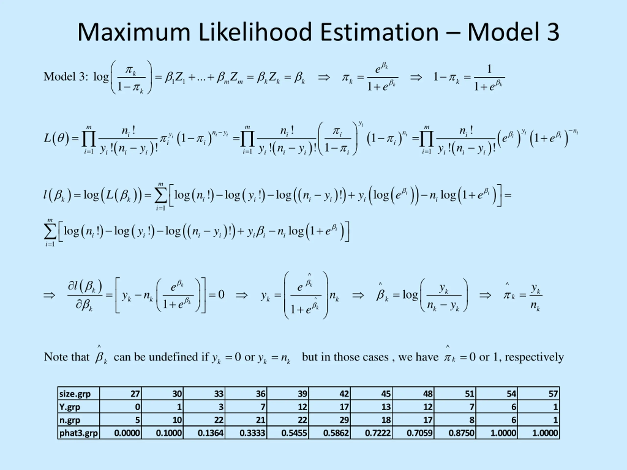 Maximum Likelihood Estimation Model 3 = 1 e e + k + + = = = = Model 3: log ... 1 k Z Z Z 1 1 m m k k k k k + 1 1 1 e k k k y i ! ! ! m m m n n n n n n )( ! ) ( ) y n ( ) ( ) ( ) n y n = = = + y i i 1 1 1 i i i i L e e i i i i i i ( ) ( ) ( i i i ! ! ! ! 1 ! y y y y y y = = = 1 1 1 i i i i i i i i i i i i i ( ) m ( ) ( ) ( ) ( ) ( ) ( ) ( ) ( ) ( ) = = + + = log log ! log ! log ! log log 1 l L n y n y y e n e i i k k i i i i i i = 1 i m ( ) ( ) ( ) ( ) ( ) + + log ! log ! log ! log 1 n y n y y n e i i i i i i i i = 1 i ^ ( ) l y y n e + e ^ ^ k k = = = = = k 0 log k k y n y n k k k k k k ^ 1 e n y k + 1 e k k k k k ^ ^ = = = Note that can be und efined if 0 or but in those cases , we have 0 or 1, respectively y y n k k k k k size.grp Y.grp n.grp phat3.grp 27 0 5 30 1 10 33 3 22 36 7 21 39 12 22 42 17 29 45 13 18 48 12 17 51 7 8 54 6 6 57 1 1 0.0000 0.1000 0.1364 0.3333 0.5455 0.5862 0.7222 0.7059 0.8750 1.0000 1.0000