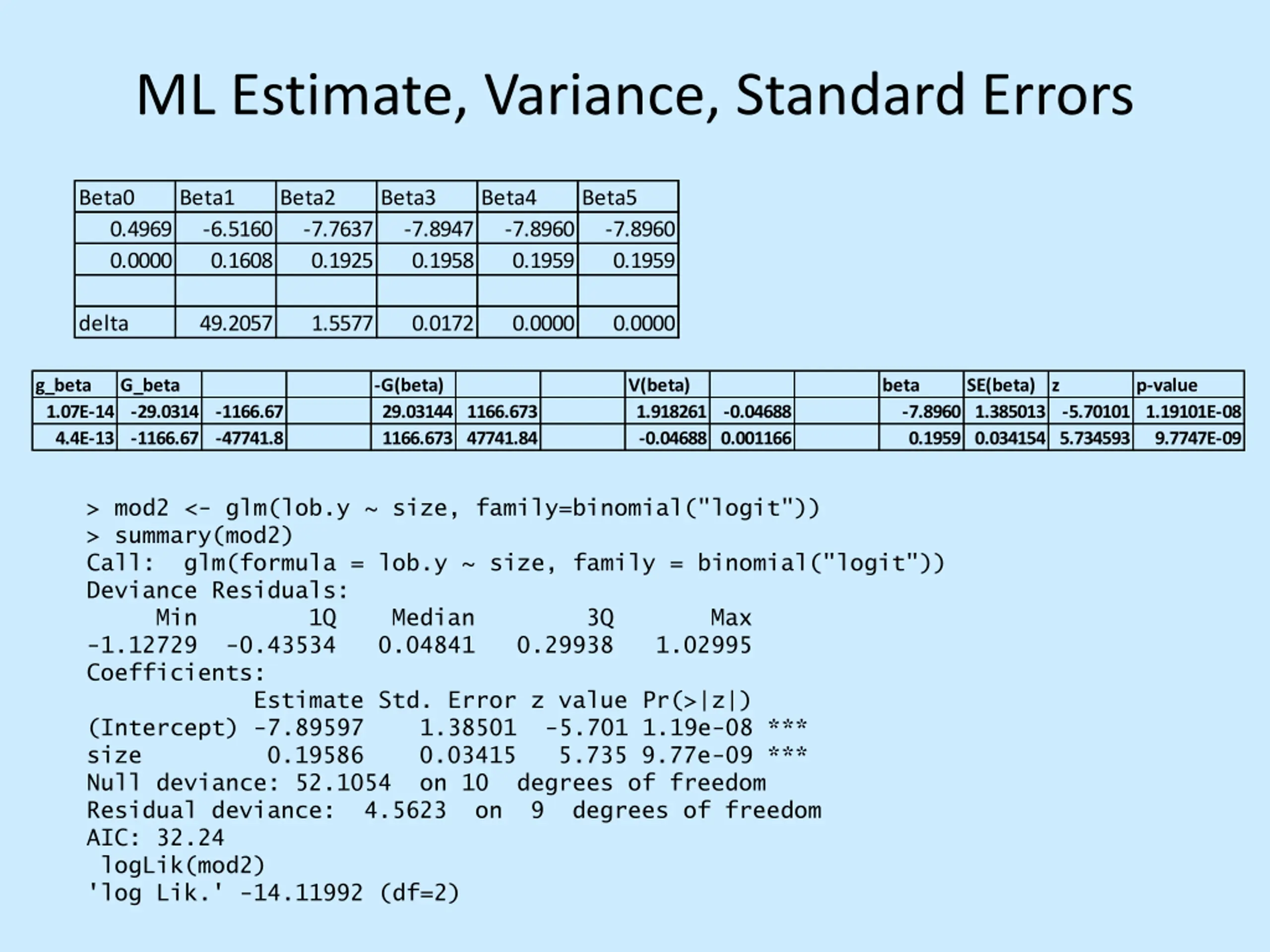 ML Estimate, Variance, Standard Errors Beta0 Beta1 -6.5160 0.1608 Beta2 -7.7637 0.1925 Beta3 -7.8947 0.1958 Beta4 -7.8960 0.1959 Beta5 -7.8960 0.1959 0.4969 0.0000 delta 49.2057 1.5577 0.0172 0.0000 0.0000 g_beta 1.07E-14 -29.0314 -1166.67 4.4E-13 -1166.67 -47741.8 G_beta -G(beta) 29.03144 1166.673 1166.673 47741.84 V(beta) 1.918261 -0.04688 -0.04688 0.001166 beta SE(beta) z p-value -7.8960 1.385013 -5.70101 1.19101E-08 0.1959 0.034154 5.734593 9.7747E-09 > mod2 <- glm(lob.y ~ size, family=binomial("logit")) > summary(mod2) Call: glm(formula = lob.y ~ size, family = binomial("logit")) Deviance Residuals: Min 1Q Median 3Q Max -1.12729 -0.43534 0.04841 0.29938 1.02995 Coefficients: Estimate Std. Error z value Pr(>|z|) (Intercept) -7.89597 1.38501 -5.701 1.19e-08 *** size 0.19586 0.03415 5.735 9.77e-09 *** Null deviance: 52.1054 on 10 degrees of freedom Residual deviance: 4.5623 on 9 degrees of freedom AIC: 32.24 logLik(mod2) 'log Lik.' -14.11992 (df=2)