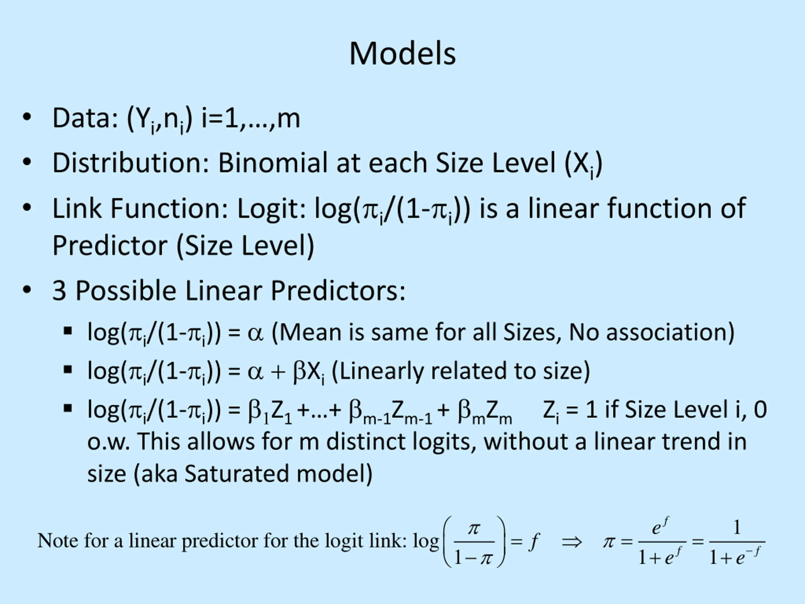 Models Data: (Yi,ni) i=1, ,m Distribution: Binomial at each Size Level (Xi) Link Function: Logit: log( i/(1- i)) is a linear function of Predictor (Size Level) 3 Possible Linear Predictors: log( i/(1- i)) = (Mean is same for all Sizes, No association) log( i/(1- i)) = + Xi(Linearly related to size) log( i/(1- i)) = Z1 + + m-1Zm-1 + mZm o.w. This allows for m distinct logits, without a linear trend in size (aka Saturated model) Zi= 1 if Size Level i, 0 f = 1 e e + = = Note for a linear predictor for the logit link: log f + f f 1 1 1 e