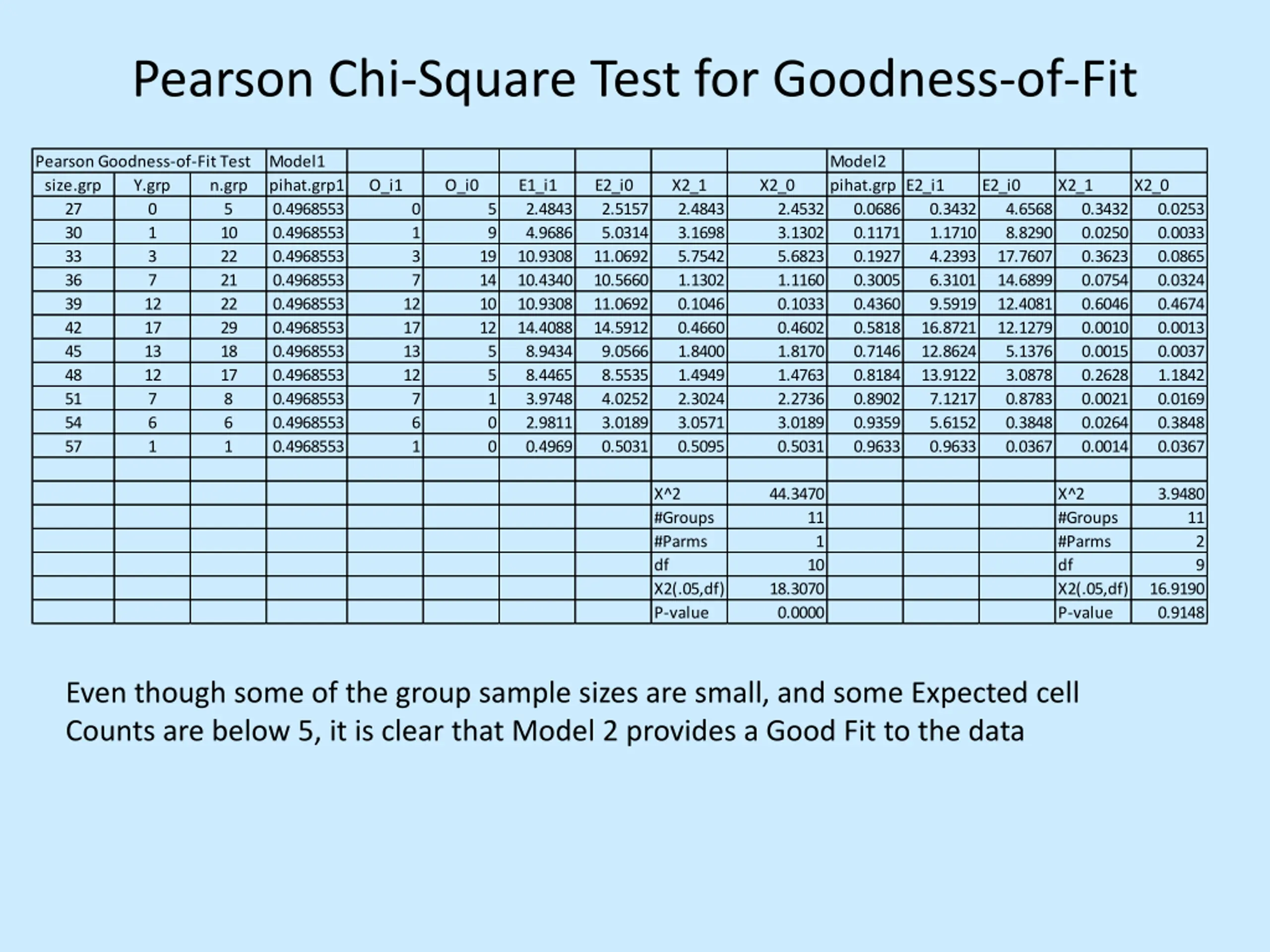Pearson Chi-Square Test for Goodness-of-Fit Pearson Goodness-of-Fit Test size.grp Y.grp 27 30 33 36 39 42 45 48 51 54 57 Model1 pihat.grp1 0.4968553 0.4968553 0.4968553 0.4968553 0.4968553 0.4968553 0.4968553 0.4968553 0.4968553 0.4968553 0.4968553 Model2 pihat.grp E2_i1 0.0686 0.1171 0.1927 0.3005 0.4360 0.5818 0.7146 0.8184 0.8902 0.9359 0.9633 n.grp 5 10 22 21 22 29 18 17 8 6 1 O_i1 O_i0 E1_i1 2.4843 4.9686 10.9308 10.4340 10.9308 14.4088 8.9434 8.4465 3.9748 2.9811 0.4969 E2_i0 2.5157 5.0314 11.0692 10.5660 11.0692 14.5912 9.0566 8.5535 4.0252 3.0189 0.5031 X2_1 2.4843 3.1698 5.7542 1.1302 0.1046 0.4660 1.8400 1.4949 2.3024 3.0571 0.5095 X2_0 E2_i0 X2_1 X2_0 0 1 3 7 12 17 13 12 7 6 1 0 1 3 7 5 9 2.4532 3.1302 5.6823 1.1160 0.1033 0.4602 1.8170 1.4763 2.2736 3.0189 0.5031 0.3432 1.1710 4.2393 6.3101 9.5919 16.8721 12.8624 13.9122 7.1217 5.6152 0.9633 4.6568 8.8290 17.7607 14.6899 12.4081 12.1279 5.1376 3.0878 0.8783 0.3848 0.0367 0.3432 0.0250 0.3623 0.0754 0.6046 0.0010 0.0015 0.2628 0.0021 0.0264 0.0014 0.0253 0.0033 0.0865 0.0324 0.4674 0.0013 0.0037 1.1842 0.0169 0.3848 0.0367 19 14 10 12 5 5 1 0 0 12 17 13 12 7 6 1 X^2 #Groups #Parms df X2(.05,df) P-value 44.3470 X^2 #Groups #Parms df X2(.05,df) P-value 3.9480 11 1 10 11 2 9 18.3070 0.0000 16.9190 0.9148 Even though some of the group sample sizes are small, and some Expected cell Counts are below 5, it is clear that Model 2 provides a Good Fit to the data